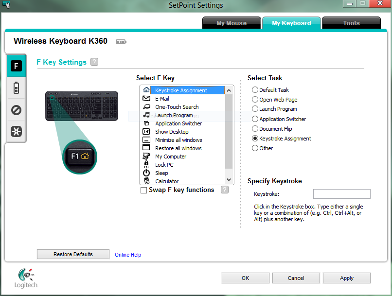 K360’ın tuşlarını ayarlayabilmek için SetPoint isimli yazılımı kurmak zorundayız. Program kutu içeriğiyle gelmiyor, dolayısıyla Logitech’in sitesinden programı indiriyoruz. Program arayüz ve kullanım itibariyle basit ve kolay. RAM tüketimi düşük(günümüz bilgisayarlarının RAM miktarları düşünülünce yazmaya bile gerek yok ama örneğin şu an baktığımda 9,2 Mb RAM tüketiyordu.).