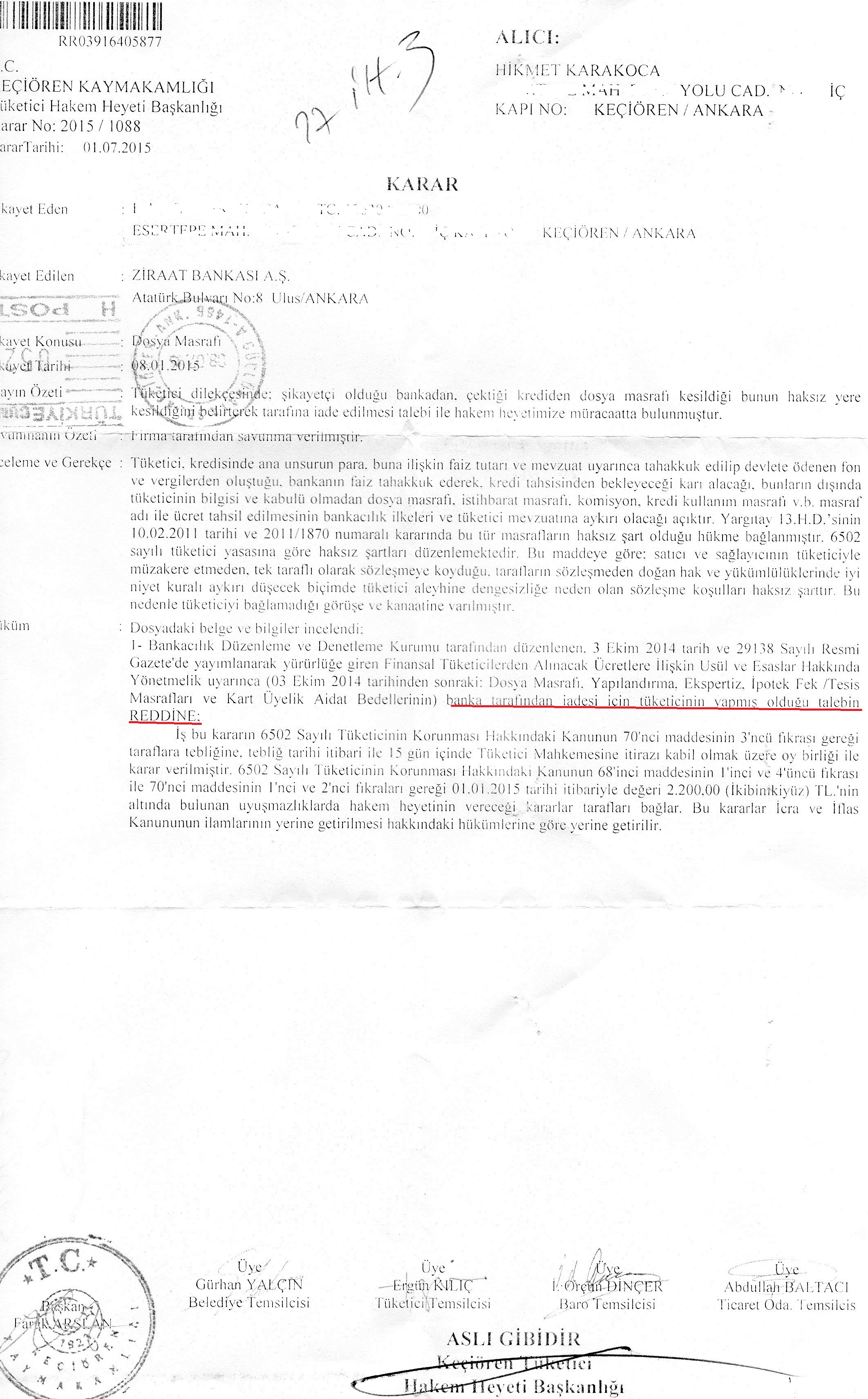 06.11.2014 tarihinde ziraat banktan konut kredisi çekmiştim.bu krediye ilişkin 525 tl kullandırım komisyonu ve 118 tl ipotek tesis ücretinin iadesi için tüketici hakem heyetine başvuruda bulundum.16.06.2015 tarihinde ptt den karar kağıdını teslim aldım.hakem heyeti başvurumu red etmiş.nasıl bir yol izlemeliyim < Resime gitmek için tıklayın > |