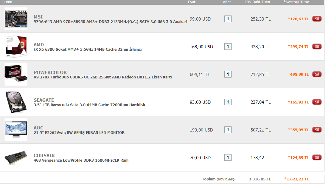 MSI 970A-G46 AMD FX X6 6300 CORSAİR VENGEANCE 4 GB DDR3 1600 Mhz CL9 Tek Modül Ram WD 3.5'' 2TB CAVİAR GREEN SATA 3.0 64 MB Cache intellipower Harddisk SAPPHİRE HD7870 O.C. GDDR5 2GB 256 BİT AMD...... PHİLİPS 21.5'' 227E4LHAB/00 GENİŞ EKRAN LED MONİTÖR HDMA özellikli XİGMATEK ASGARD 382 PURE BLACK EDİTİON 600W MidT ATX SİYAH KASA ASUS DVD YAZICI S-LİNK HDMA KABLO Toplamda 2078 TL tuttu. Görüşlerinizi çok merak ediyorum Vatandan toplandı %30 indirim var diye aldım.Biraz aceleye gelmiş olabilir.İnşallah pişman olmam. Birde montajını biz yaparız dediler bende olur dedim telefon bekliyorum kasa hazır olunca gidip alıcam montaj sırasında parça değişimi felan yaparmı bunlar ya da bozuk kırık bi parça eklerler mi acaba güvenemedim de. |