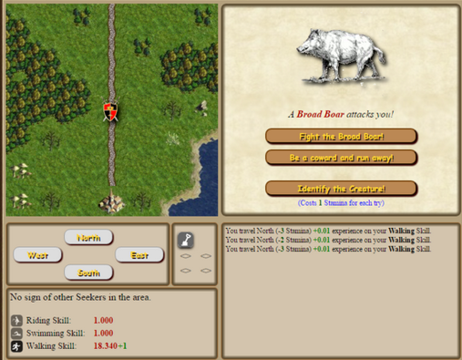 Daha önce söylediğim gibi oyuna günlük 5-10dk ayırmanız kafi. Bunun nedeni oyun size günlük belli bir hareket hakkı veriyor(100 stamina). Ve siz bunu istediğiniz doğrultuda kullanabiliyorsunuz. İster kasabada yönelmek istediğiniz mesleğe yönelik harcarsınız, ister kasaba dışında gezerek tüketebilirsiniz. Tabi elinizi kolunuzu sallayarak gezemiyorsunuz, vahşi hayvanlar ve haydutlar sizi rahat bırakmıyor.