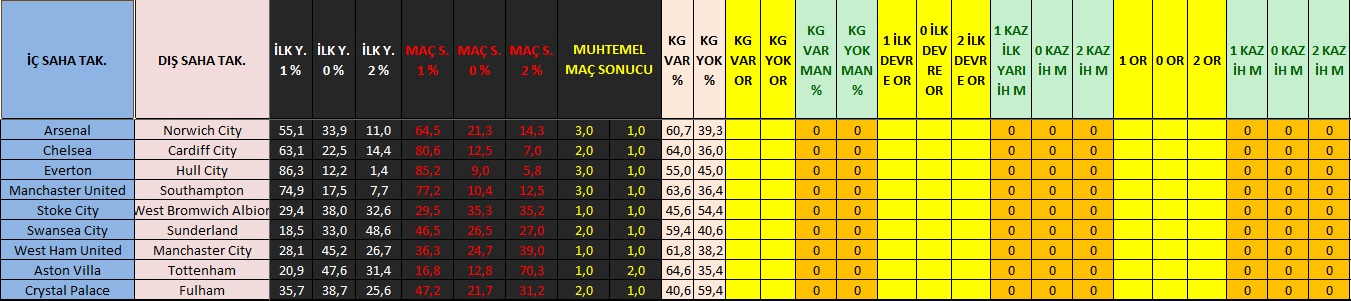 Arkadaşlar, Algoritmasını hazırlamak için aylarca birçok iddaa sitesini inceledim. Birçok bu tarz program yapan kişiyle konuştum. Şu anda 13. versiyonunu hazırladığım programımın küçük bir bölümünün ekran görüntüsünü paylaşıyorum. Önümüzdeki hafta oynanacak İngiltere premier liginin maç % leri ni de belirttim. İddaa oranı olmadığından program tavisyede bulunmuyor ancak. Maçları ve ilk yarı maç sonu verdiği % leri inceleyerek yorumlarınızı bekliyorum. Handikap ta hesaplıyor onu da daha sonra yayınlayacağım. Tabu bu % lerin tek başına hiçbir anlamı yok. Onu iddaa nın verdiği oranlar anlamlandıracak. Ancak oda yetmez! Neden? Çünkü iddaa da şans faktörü büyüktür. İstediğiniz kadar gerçekçi % ler hesaplayın mantıklı kuponlar yapın Şans faktörünü minimize etmeden kazanç yine şansa bağlıdır. Şans nasıl minimize edilir? (şanstan kastım o maçtaki sakatlık kırmızı kart vb. olabilecek olumsuzlukların tümü) Şansı minimize etmenin yolu küçük miktarda çok kupon yani sitem oynamaktır. 10 maç seçip 3 lü sistem yapsan 120 tl harcayıp 140 - 150 tl kazanırsın. Neden bu kadar az diyenlere cevabım az ama öz olacak. Diğer türlü Her maçta potansiyel olarak %17 zaradasın. İddaanın verdiği oranları hesaplayıp % ye vurun ne demek istediğimi anlayacaksınız. Neden bunu burada anlatma gereği duydum? Çünkü etrafımda birçok kişinin çok paralar kaybettiğini ve iddaa şirketlerinin hızla çoğalarak zenginlediğini görünce boş duramadım. Programın çalışma mantığı nedir? Benzersiz algoritması sayesinde en gerçekçi haliyle maçtaki birçok ihtimali % olarak hesaplayıp iddaa nın oranlarıyla çarpıyor. Sonucu 100 puanın üzerinde olan ihtimal varsa buna oyna diyor. Yani alacağın risk kazancından az oynamak mantıklı diyor. Yoksa genelde iddaada aldığınız risk kazancınızdan fazladır. Sorunuz veya ilaveniz olursa cevaplamaya hazırım. < Resime gitmek için tıklayın > |