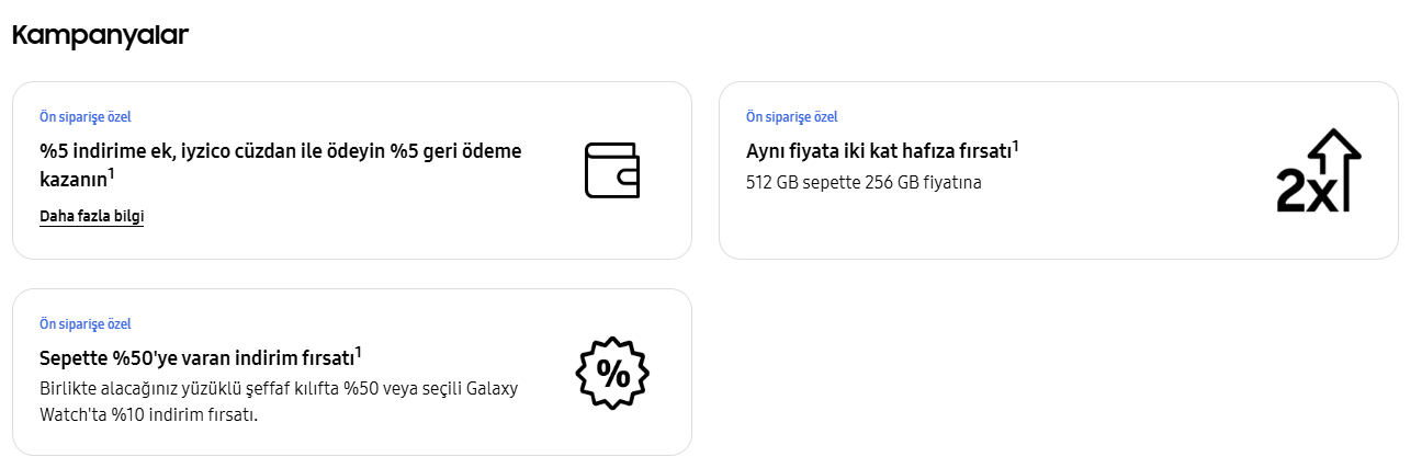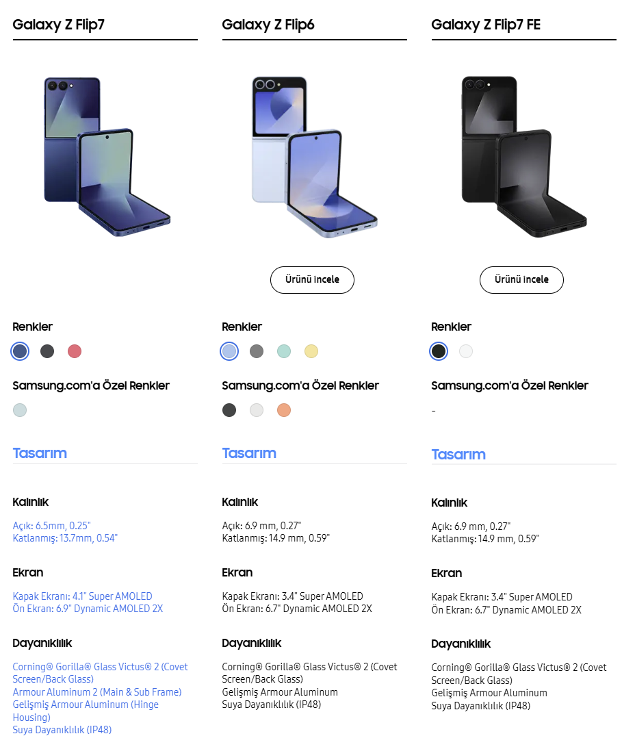 Galaxy Z Flip6 ve Z Flip7 FE ile karşılaştırıldığında özellikleri şu şekilde: < Resime gitmek için tıklayın > < Resime gitmek için tıklayın > Cihaz şu an için ön siparişte. Şu an için en hesaplı seçenek Samsung shop Eğitim indirim programı mağazasında. Ön sipariş kapsamındaki indirim ve avantajlar şunlar: < Resime gitmek için tıklayın > Buna göre normal Samsung shop mağazasındaki fiyat şu şekilde: < Resime gitmek için tıklayın > Eğitim indirimi programı sayfasındaki fiyat şu şekilde: < Resime gitmek için tıklayın > Ayrıca iyzico cüzdan ödemelerinde şu kampanya var: < Resime gitmek için tıklayın > Ayrıca eğer Galaxy Unpacked etkinliğine kaydolmuşsanız, gelen kod ile 3399TL'lik ek ürünü ön sipariş aşamasında sepetinize ekleyerek ücretsiz alabilirsiniz. < Resime gitmek için tıklayın > |