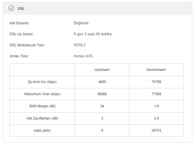 Aşağıda en başından başlayarak sizlere tüm her şeyi anlatıyorum. Bu konularda çok bilgim yok o yüzden sorunun nerede olduğunu bilmiyorum. Bana yardımcı olursanız çok sevinirim, teşekkürler. Yaklaşık 1 hafta kadar önce 35 mbps Turk Telekom bağlantısından 16 mbps Adsl TurkNet bağlantısına oradan da paket yükselterek 100 Mbps Vdsl TurkNet bağlantısına geçtim. Turknet Adsl 16 mbps bağlantıya ait değerler aşağıdaki gibidir. < Resime gitmek için tıklayın > 100 Mbps bağlantıya geçtiğimde yeni aldığım Tp-Link Archer Vr1200 modemim 18 mbps üzerine çıkamıyordu. Eski modemim olan Zyxel vmg3312-b10b ise 100 mbps hızlara çıkıyordu. Yeni aldığım modemi test etmek için hızımın 75 mbps'ye düşürülmesini istedim. 100 mbps'ye ait değerler aşağıdaki resimde görüldüğü gibidir. < Resime gitmek için tıklayın > Neyse bir şekilde yeni olan Tp-link Vr1200 modem 75 mbps hızlara ulaşmayı başardı herhangi bir şey yapmadım kendi kendine düzeldi. Şuan hala 75 mbps kullanmaktayım fakat yer yer bazen saatte bir yer yer 5 saatte bir internet kopmaları yaşıyorum bugün fark ettiğim kadarı ile de bazen kopma yaşamıyorum fakat margin değerim yerleri görüyor ve modemi resetlemeden düzelmiyor biraz daha düşüş yaşanırsa da kopuyor ve bağlantı yenilenmiş olduğu için stabil haline dönüyor. Bu döngü bu şekilde devam ediyor. Eski modem ile 1 günlük test yaptım 9 saatlik ve 5 saatlik bağlantılar sonucu 2 adet kopma yaşadım modemden şüpheleniyordum böyle olunca o şüphe de ortadan kalktı. Splitter aradan kaldırılarak direk hat-modem bağlantısı yapılarak test edildi sonuç yine aynı anlık olarak margin düşüşü oluyor. TurkNet 75 mbps bağlantıma ait stabil ve bahsettiğim kopmaya yaklaşan değerler aşağıdaki resimlerde görüldüğü gibidir. Stabil değerler; < Resime gitmek için tıklayın > < Resime gitmek için tıklayın > < Resime gitmek için tıklayın > Anlık olarak kopma yaşadığım, kopmaya yakın değerler; < Resime gitmek için tıklayın >< Resime gitmek için tıklayın > < Resime gitmek için tıklayın >< Resime gitmek için tıklayın > < Resime gitmek için tıklayın > Anlık olarak ise durum şu şekilde bağlıyım fakat margin değerim yerlerde nasıl kullanıyorum hiç bir fikrim yok. < Resime gitmek için tıklayın > < Resime gitmek için tıklayın > |