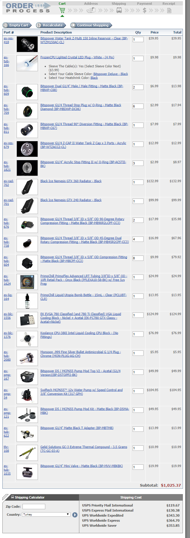 Hakikaten öyle. Extraları çıkartıp kasada kullanılan sıvı soğutma parçalarını filtreleyip tekrardan sepete atınca böyle bir şey çıkıyor ortaya. Bütün gönderileri UPS ile aldığım için kargo ücretinin de maşallahı var < Resime gitmek için tıklayın > |