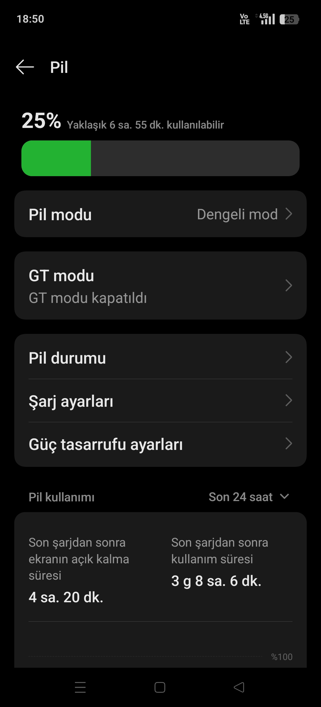 | iyi günlerde kullanın, ben 4 saat 20 dakika ekran süresi ile yaklaşık 3.5 gün kullandım tek şarj ile, %25 de halen şarj vardı |