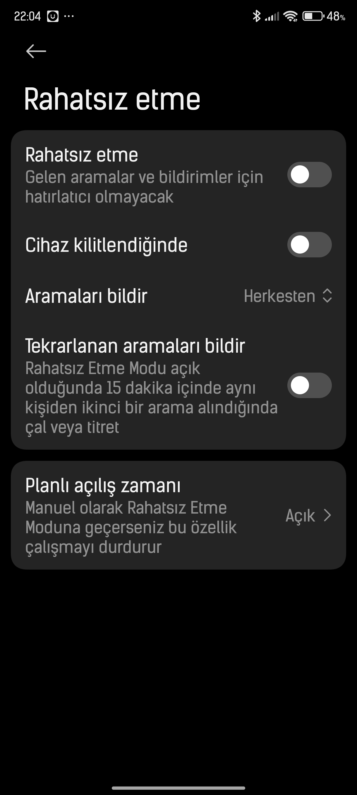Cihaz da ki onlarca sorunları daha önce ki konu da yazmıştım ama bir kişi bile cevap yazamamış, başlıkta yazan sorun ise çok sık olmaya başladı, cihaz da rahatsız etme özelliği kapalı olduğu halde, resimler de yer alan menüde ki "planlı açılış zamanı" kafasına göre aktif hale geliyor ve ekran da "rahatsız etme modu açıldı" diye uyarı geliyor mecburen manuel olarak kapatıyorum, bunun çözümü var mıdır diye sormak istedim. servise de zaten ulaşılmıyor, distribütör'e de kulaşmak imkansız zahmet edip müşteri ile de görüşmüyorlar, bu kadar rezil bir yazılım ve satış sonrası destek veren başka bir marka görmedim.