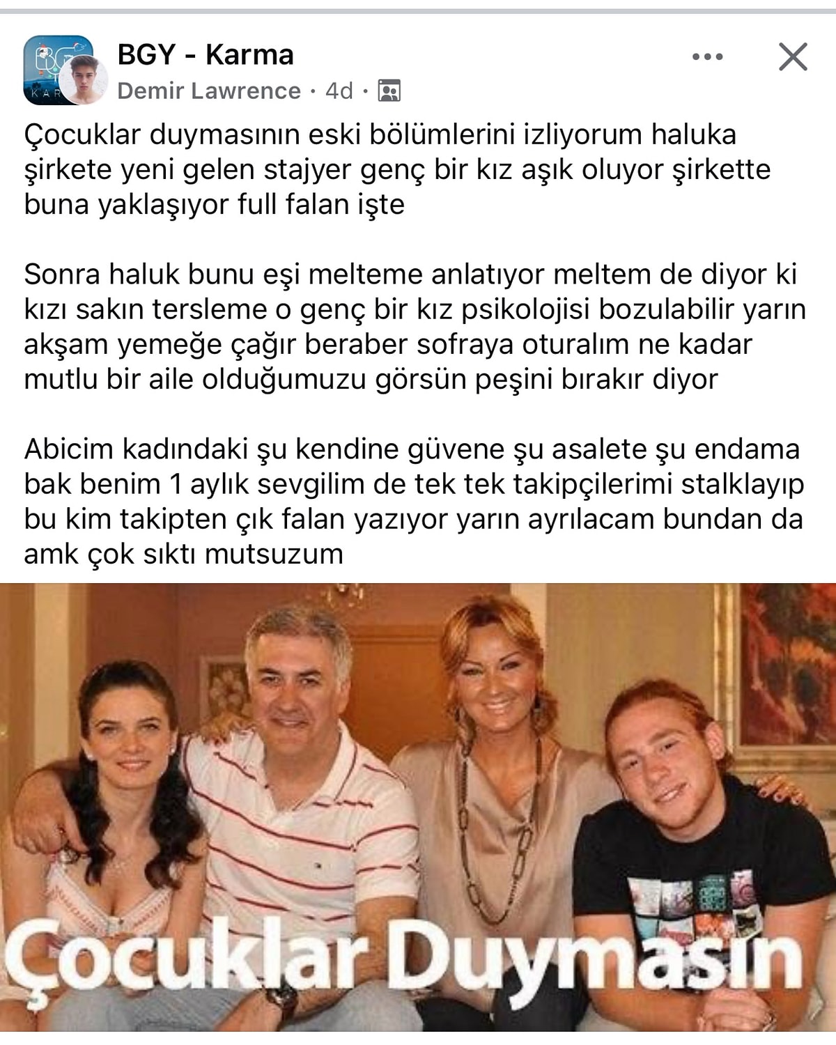 2011 yılında yayınlanmış Çocuklar Duymasın dizisinde Meltem'deki medeniyete bakar mısınız. Meltem gibi çağdaş insanlar hep yurt dışına kaçtı gitti şuanda ülkede Meltem'in yaptığını algılayabilecek insan bile yok. Bu kadar kötü durumdayız. Ülkedeki toplumsal çürüme ve gerileme her alanda hissediliyor.