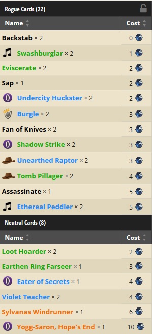 Hırsızlık temalı destem Spesifik birkaç kart kullanıyorum, magelerin arttığı şu zamanlarda Eater of Secret baya faydalı oluyor. Bugün bi' 10 maç kadar oynadım ilginçtir ki hiç jade druid denk gelmedi, deneyemedim. < Resime gitmek için tıklayın > |