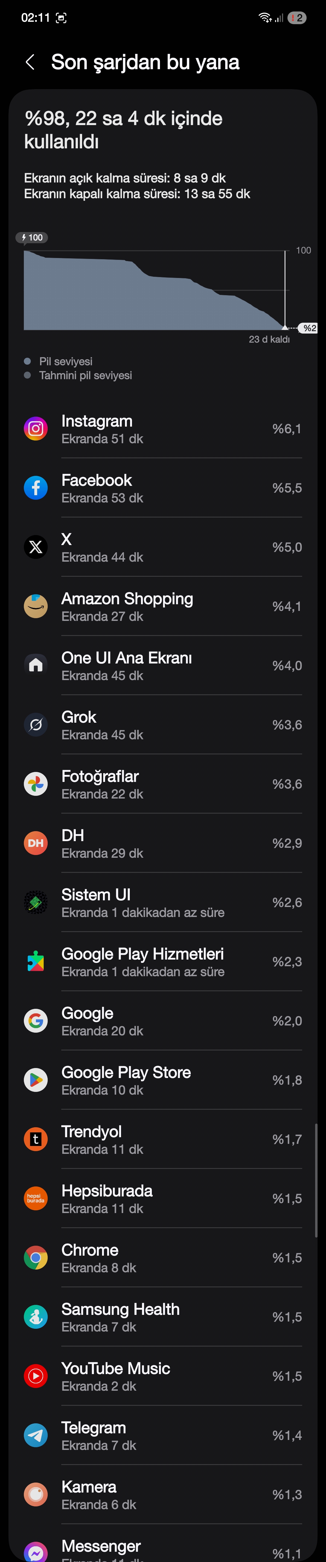 Yüzde 30 mobil veri ve gündüz adaptif full parlaklık 120 hz full açık konum açık saat kulaklık bağlı şekilde 8 saati geçtik çok şükür :) telefonun çekim gücü tartışılır ama pil ömrü özellikle s20fe den geçen benim gibi bir kullanıcı için gerçekten çok iyi.