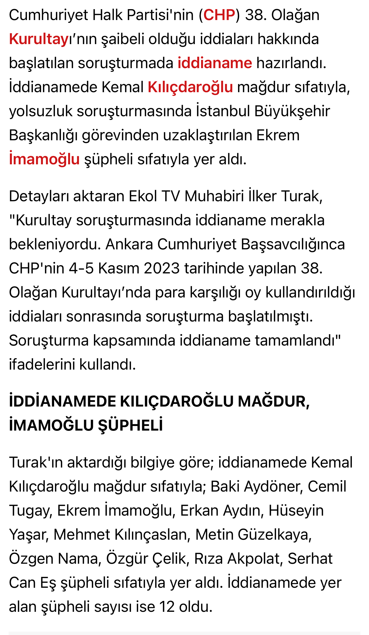 Önce diploması iptal edilen, sonra yolsuzluk, terör, suç örgütü liderliği ile suçlanan Ekrem İmamoğlu şimdi de CHP’nin Özel’in kazandığı kurultayla ilgili soruşturmada şüpheli olarak yer aldı.