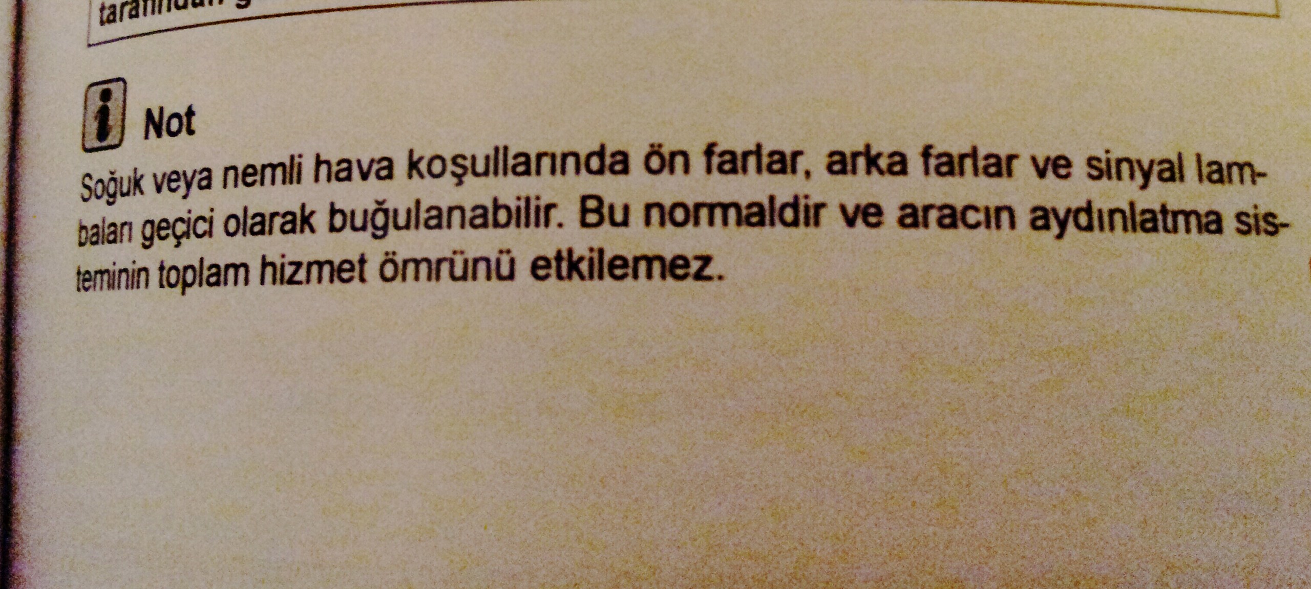 Bu yoğuşma aşırı şekilde olur ve damlacık forumuna dönüşürse; farın içinde su göllenirse servis değişim sağlıyor. Ancak geçici buğu şeklinde olup seyir haline geçince geçiyorsa sorun yok. Aynı şekilde sis farı ve stoplarda da buğu oluşabilir. Kullanım klavuzunda ayrıca serviste yayınlanan bülten aynı şekilde buğunun sorun oluşturmadığını ve su alma söz konusu olursa değişim yapılması gerektiği yönünde.