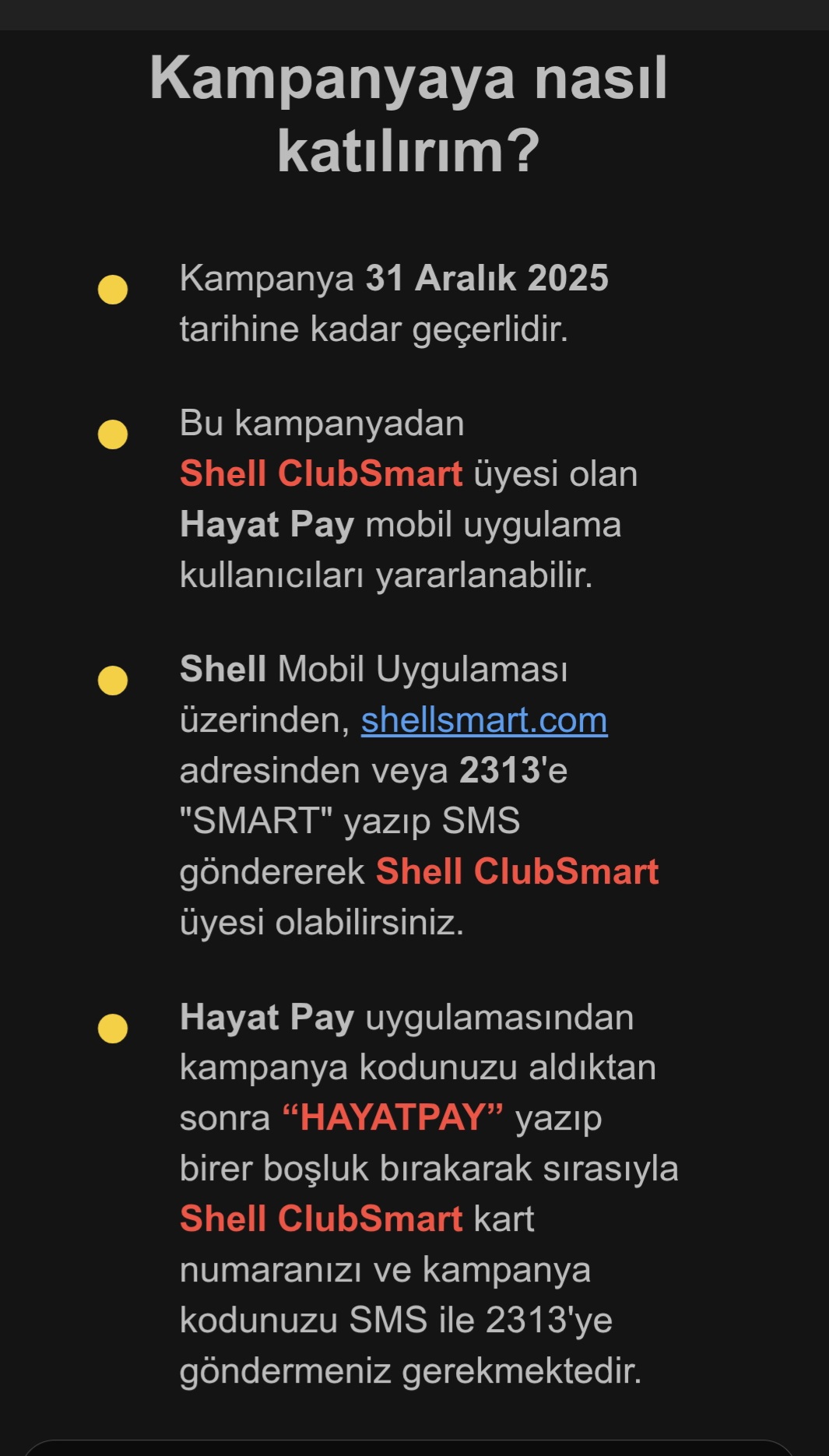Hayatpay uygulamasından shell de 100 tl hediye kodunuzu alip kart numaranizla sms atin < Resime gitmek için tıklayın >