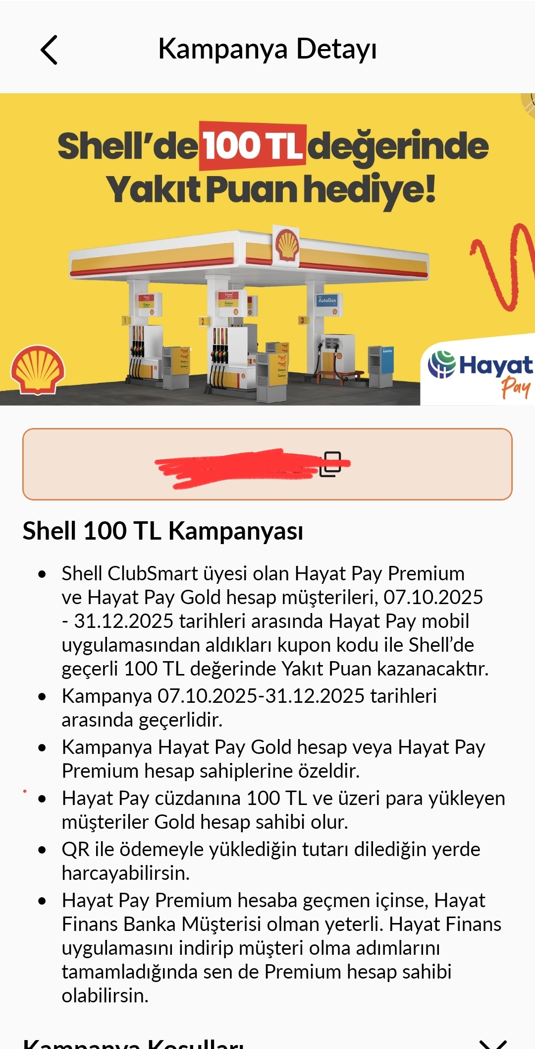 Hayatpay uygulamasından shell de 100 tl hediye kodunuzu alip kart numaranizla sms atin