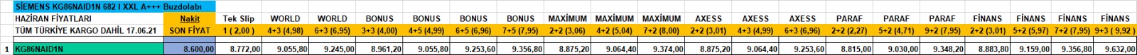 Arkadaşlar merhaba. KG86NAID1N modelinin yeni kodu: KG86NAID2N olarak üretilmiştir. Ürünün ve diğer XL XXL modellerin fiyatları aşağıdaki gibidir. Bilgi ve sipariş için arayabilirsiniz. Kampanya koşullarını sağlama doğrultusundan fiyatlar geçerlidir kampanya bitmesi durumunda maalesef rakam sağlanamayabilir. Saygılar. Serdar Çetin 05533976676 < Resime gitmek için tıklayın > KG86NAID1N 682 l XXL A+++ Buzdolabı - https://i.hizliresim.com/q3gfgux.jpg Yeni çıkan XL – XXL Buzdolapları https://i.hizliresim.com/3dym2jr.jpg |