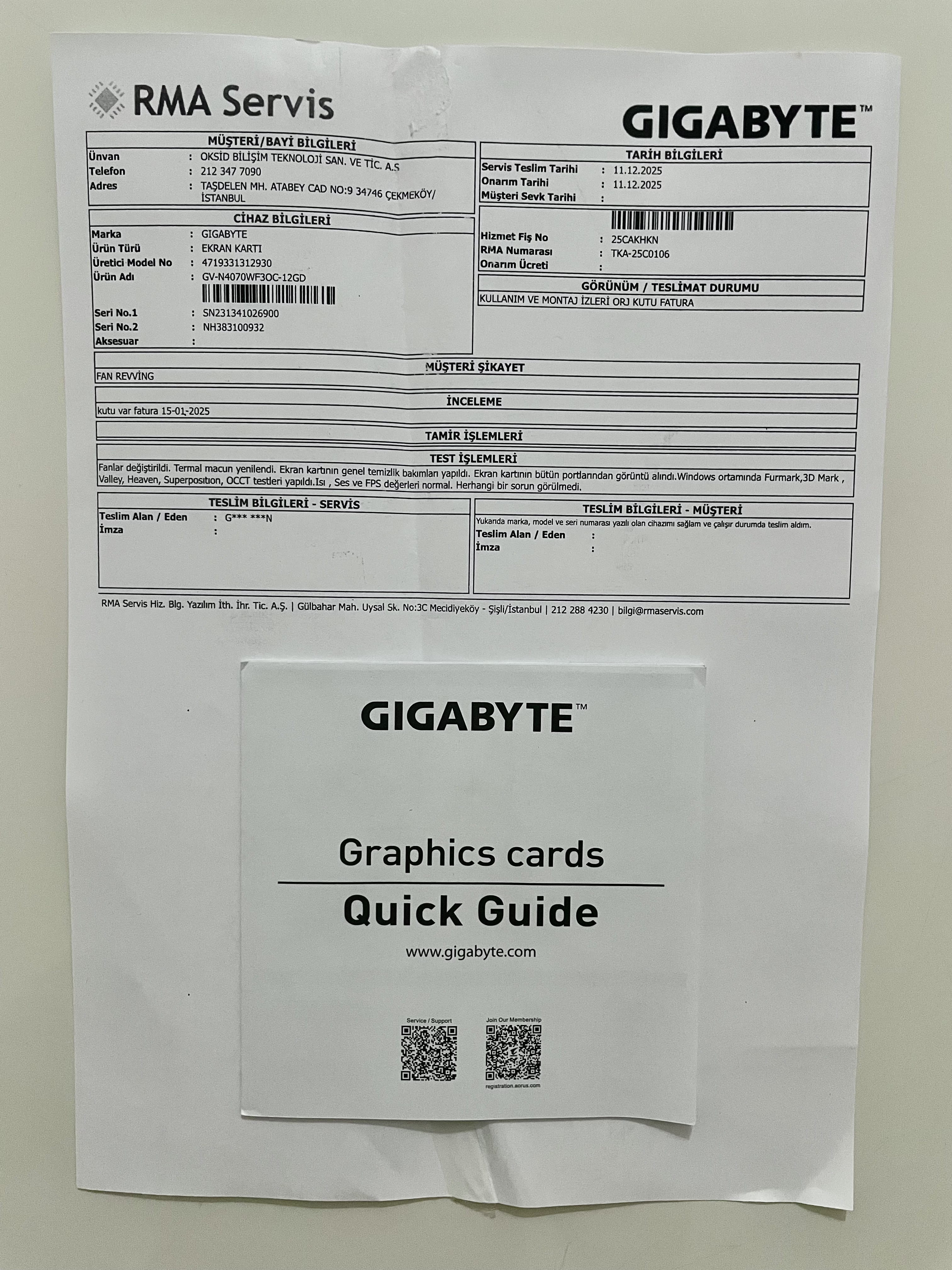 Gigabyte GeForce RTX 4070 Windforce OC GV-N4070WF3OC-12GD Ekran kartının fanları sıfır, termal macunu sıfır. Fanlarının birinde sorun vardı, garantiye gönderdim. Gigabyte yetkili servisi tarafından 3 fanda üst model sıfır fanlarla değiştirdi, macun değişimi dahil bakım ve tüm kontrolleri yapıldı. Ekran kartı kendi sistemimde RTX 5080’e geçtiğim için satılık, servis bakımından sonra test haricinde hiç kullanılmadı. Ekran kartı şu an sıfır aldığım günden daha sessiz ve daha düşük sıcaklıkta çalışıyor. Haziran 2026’ya kadar garantisi var. KFG tam.