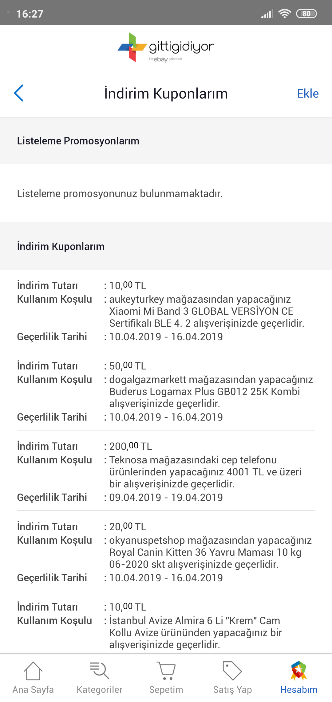 Şu listeleme promosyonlarım kısmında mı çıkması gerekiyor? Ben 18 Mart'ta almıştım. Canlı desteğe yazdım az önce ve "İndirim çeki bugün de tanımlanabilir. Eğer tanımlanmazsa yarın bizimle iletişime geçmenizi rica ediyorum." yanıtını aldım. Bakalım sonuç ne olacak. < Resime gitmek için tıklayın > |