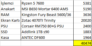 Kasayı kendim toplayacağım, DDR5 olmasını tercih ettim. Soğutucu konusunda açıkçası pek bilgim yok, kasa konusu da şuan çok karışık geldi rastgele yazdım ama daha 2K monitör alacağım için 40K yı çok geçme tarafarı değilim. Parçalar özelinde şu daha iyi olur diyebileceğiniz konularda her türlü fikre açığım. Teşekkürler