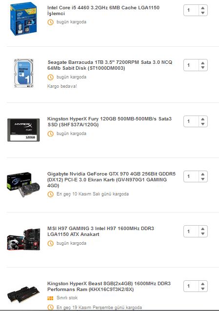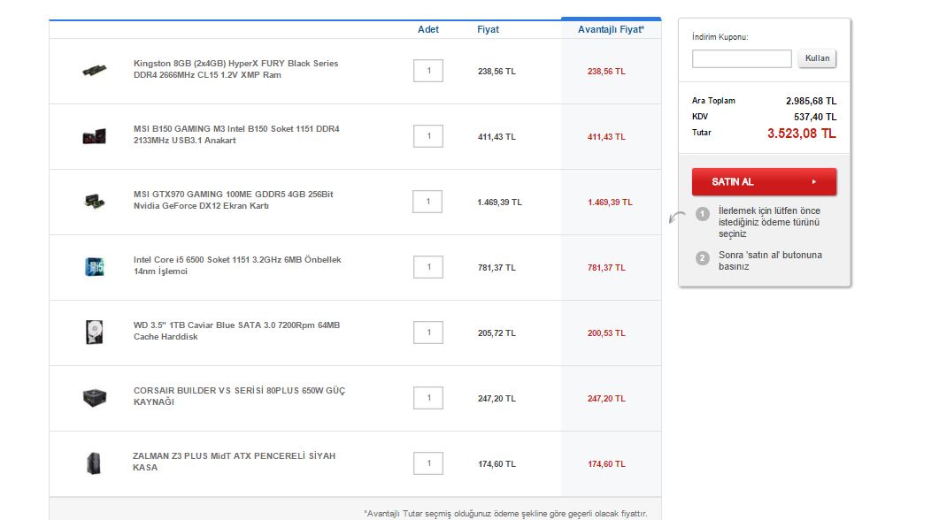 2 si arasında cooler master daha iyi fakat hepsiburada dan baktığına göre kendin birleştireceksin hepsiburada birleştirme yapmaz.Yani bütün sitelerden ürün seçebilirsin. ddr4 için alman gereken ana parçalar şöyle olabilir http://www.vatanbilgisayar.com/msi-b150-gaming-m3-intel-b150-soket-1151-ddr4-2133mhz-usb31-anakart.html?keywords=b150 http://www.vatanbilgisayar.com/intel-core-i5-6500-soket-1151-32ghz-6mb-onbellek-14nm-islemci.html http://www.vatanbilgisayar.com/kingston-8gb-2x4gb-hyperx-fury-black-series-ddr4-2666mhz-cl15-12v-xmp-ram.html?srt=UP&keywords=ddr4 bütçeni aşarsa anakart bu olabilirhttp://www.vatanbilgisayar.com/msi-b150m-bazooka-intel-b150-soket-1151-ddr4-2133mhz-usb31-anakart.html?keywords=b150 ben örnek bir sistem bırakayım ddr4 vatandan almak zorunda da değilsin Msi yerine evga veya başka marka ekran kartı alabilirsin daha uyguna gelir . < Resime gitmek için tıklayın > |