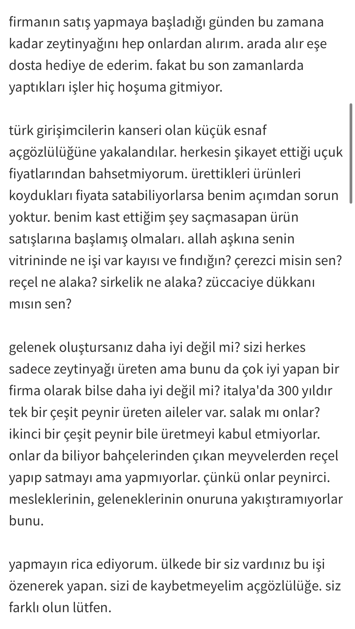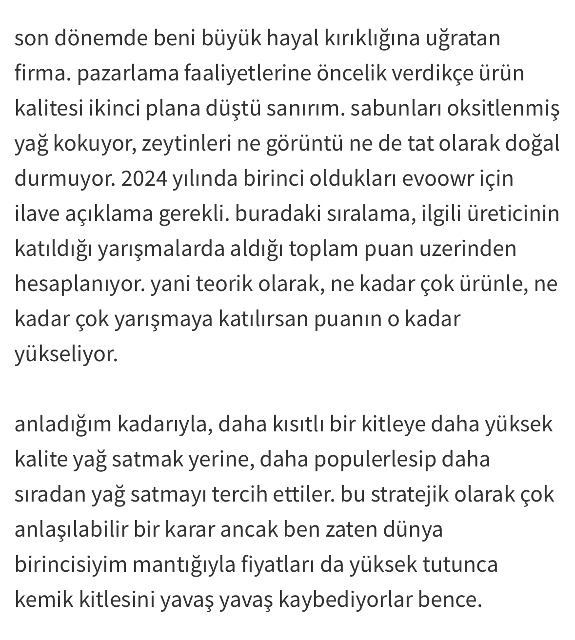 Tüh! Maaşalah dediğim 4 gün yaşadı! Diğer ürünlerde de %5-20 civarında bir zam uygulanmış ama Picual %25 ile başı çekiyor. Marka sadakati açısından çok yanlış bir uygulama. Yeni yıl ile birlikte fiyatlarına güncelleme yapan firmalar var ama bunu bir doğru iletişim ile tarih vererek müşterilerine önceden duyuruyorlar (gıdaormanı). Keşke bir gecede zam yapmak yerine bunu güzel yönetebilselerdi. Kontrol amaçlı instagtam hesaplarına baktım EVOOWRde 19. olduklarını duyurmuşlar. Bunu önemsediklerine göre muhtemelen danışmanları aynı kişi. Yine de kusursuz ve muhtemelen ödül alacak ürünlerini sattıkları için teşekkür ediyorum. Ancak gelecek yıl muhtemelen tercih etmeyeceğim. Çünkü 500ml fiyatı 26 eurya geliyor. Bu fiyata daha kaliteli Picual bulurum çok büyük ihtimalle. Castillo de Canena’nın bile en özel serisi 24 Eur olduktan sonra! https://www.castillodecanena.com/producto/primer-dia-de-cosecha-picual/ |
