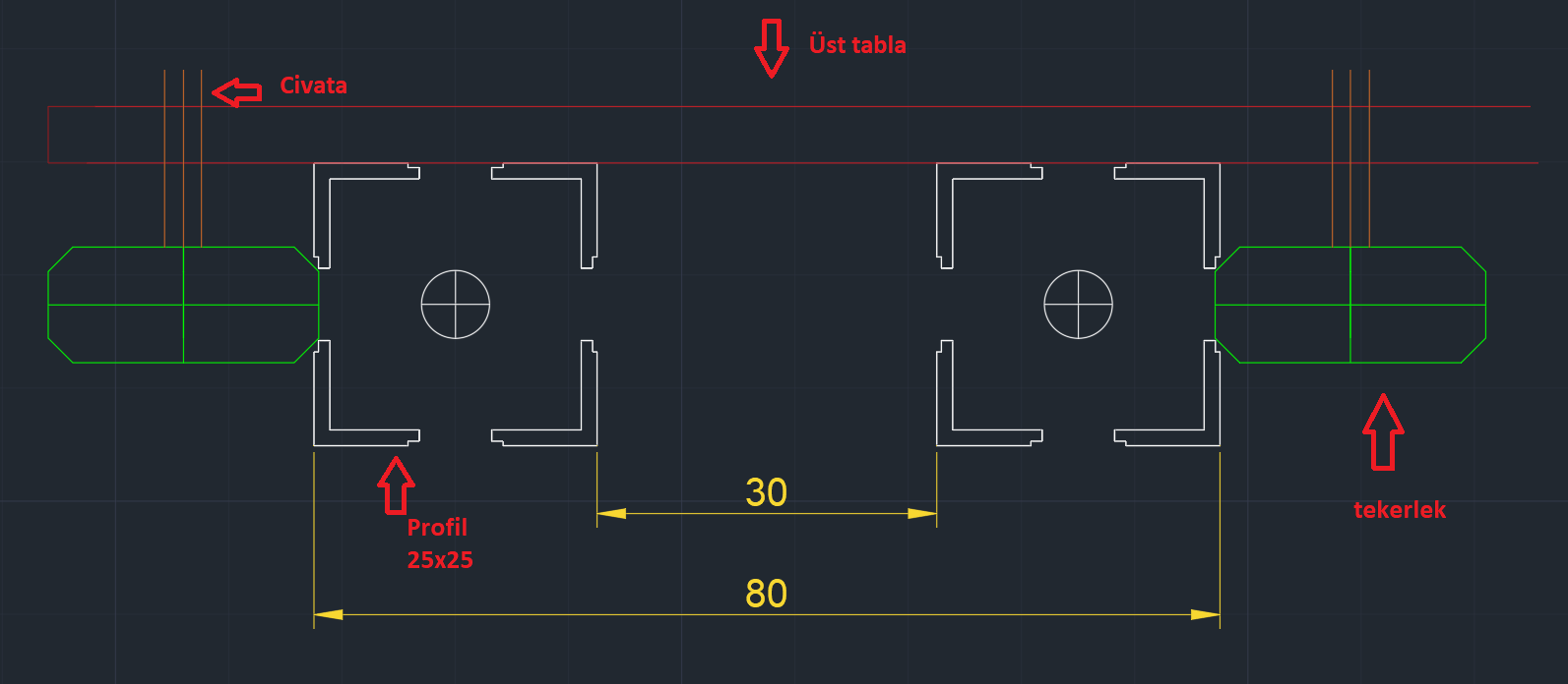 Motorlu Camera slider yapıyorum 3D printerdeki raylı ve kayışlı sistem. Buda örnek proje videosu Videoyu izlemek için tıklayınız Üstteki sistem :https://tr.banggood.com/Machifit-V-Slot-Gantry-Plate-Five-Roulette-Special-Slide-Plate-for-2020-Aluminum-Profile-CNC-Router-Machine-p-1410067.html?cur_warehouse=CN Benim sorunum şu mesela yukarıda linkini verdiğim ürün 20x20mm lik tek bir sigma profile göre yapılmış. Bendeki profil ise 25x25mm sigma profil ve 2 tane yan yana olucak. 25x25mm sigma profillerin arasında 30mm boşluk olucak şekilde montajını yapıcam bu resimde kaba taslak çizip göstermeye çalıştım rayın üstünde gidicek bu mekanizma.Burda hesabını yapamadıgım şey tekerleğin rayın o resimde gözüktüğü boşluğa ne kadar gireceği.Bu çizim konusunda yardımlarınızı bekliyorum.Valla kaç gündür uğraşıyorum Liseden 8 yıl önce öğrendiğim autocad ile az çok anlatmaya çalıştım bu resimde![]() < Resime gitmek için tıklayın > Bendeki profil bundan. < Resime gitmek için tıklayın > Buda kullanacagım tekerlek. < Resime gitmek için tıklayın > |