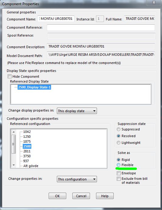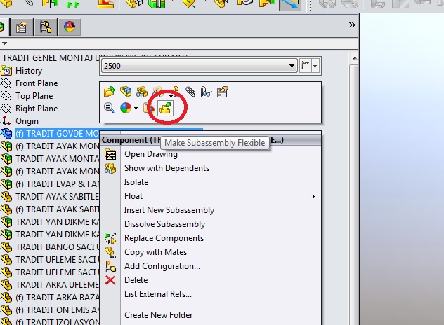 montajın içinde bulunan alt montaja tıkla oradan "make subassembly flexble" ı seç. < Resime gitmek için tıklayın > 2013 ve alt sürümünü kullanıyor isen alt montaja tıkladıktan sonra çıkan ufak pencerenin sağ üstünde bulunan "compenent properties"e tıkla ve ardından "flexible" seç: < Resime gitmek için tıklayın > |