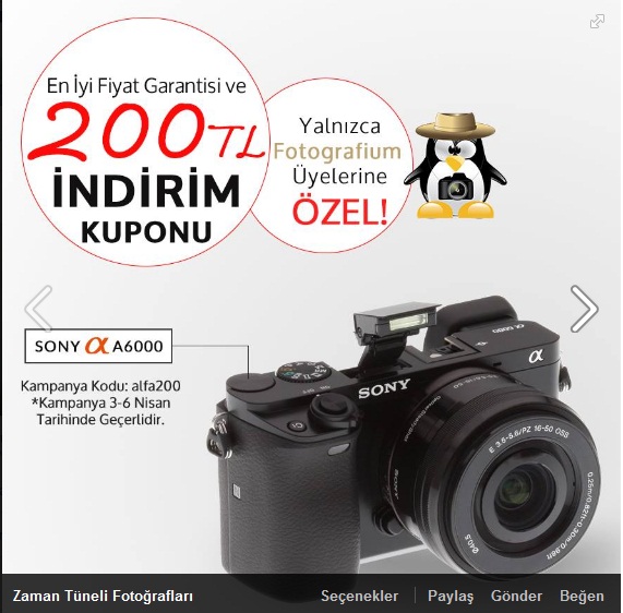 Merhaba herkese. Face' de az önce gezinirken bir hadise ile karşılaştım. Fotografium' da A6000 ile ilgili bir kampanya var, 2199TL' ye satılan ürün indirim çeki ile beraber 1999TL' ye düşüyor bence kaçırılmaması gereken bir fırsat bende almayı düşünüyorum. Tek durum kodu kullanmak oluyor eğer kalırsa 5 ' i gibi bende alacağım yararlanmak isteyenlere ödeme sayfasında 200 tl düşüren kod; (denendi ) alfa200 Buda linki :http://fotografium.com/urun/sony-alpha-a6000-16-50mm-aynasiz-dijital-fotograf-makinesi?___SID=U#.VR6RCI64H7A < Resime gitmek için tıklayın > |