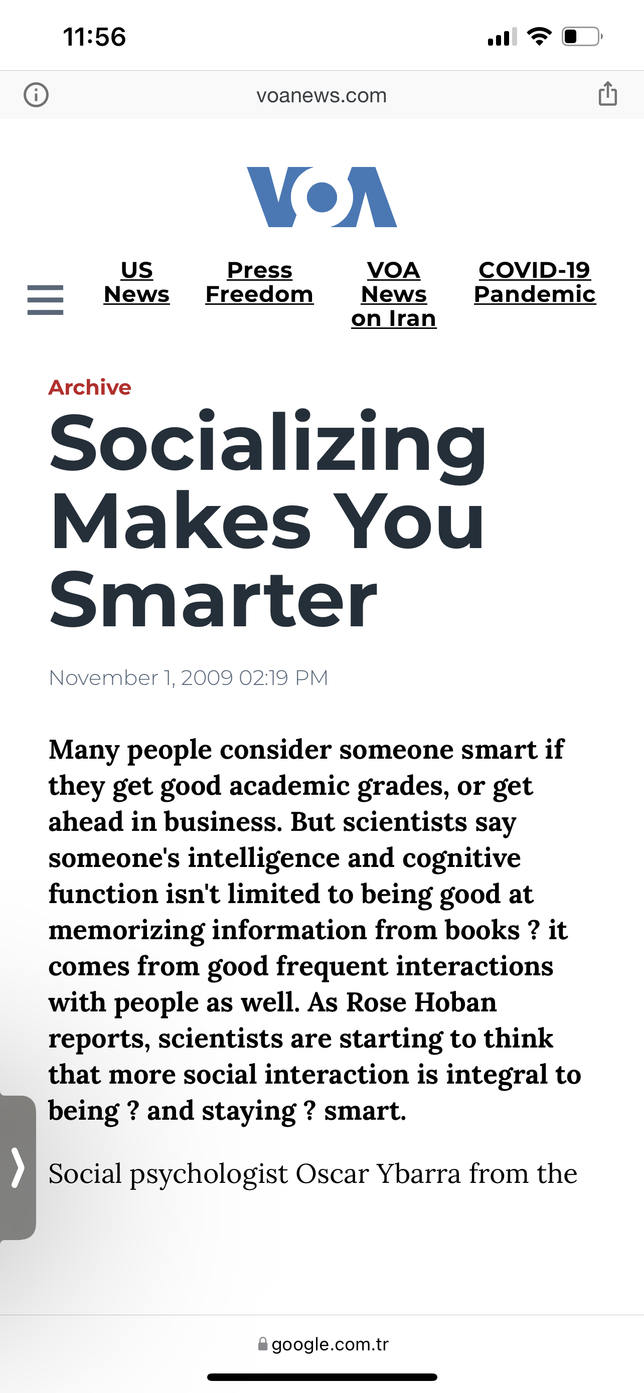 Buradan da bir dinleyin isterseniz… https://www.youtube.com/watch?v=XAGBBt9RNbc&feature=youtu.be Ya da burada < Resime gitmek için tıklayın > https://www.voanews.com/archive/socializing-makes-you-smarter Başka bir makale ve araştırma sonucu < Resime gitmek için tıklayın > https://www.sciencedaily.com/releases/2008/02/080215135707.htm |