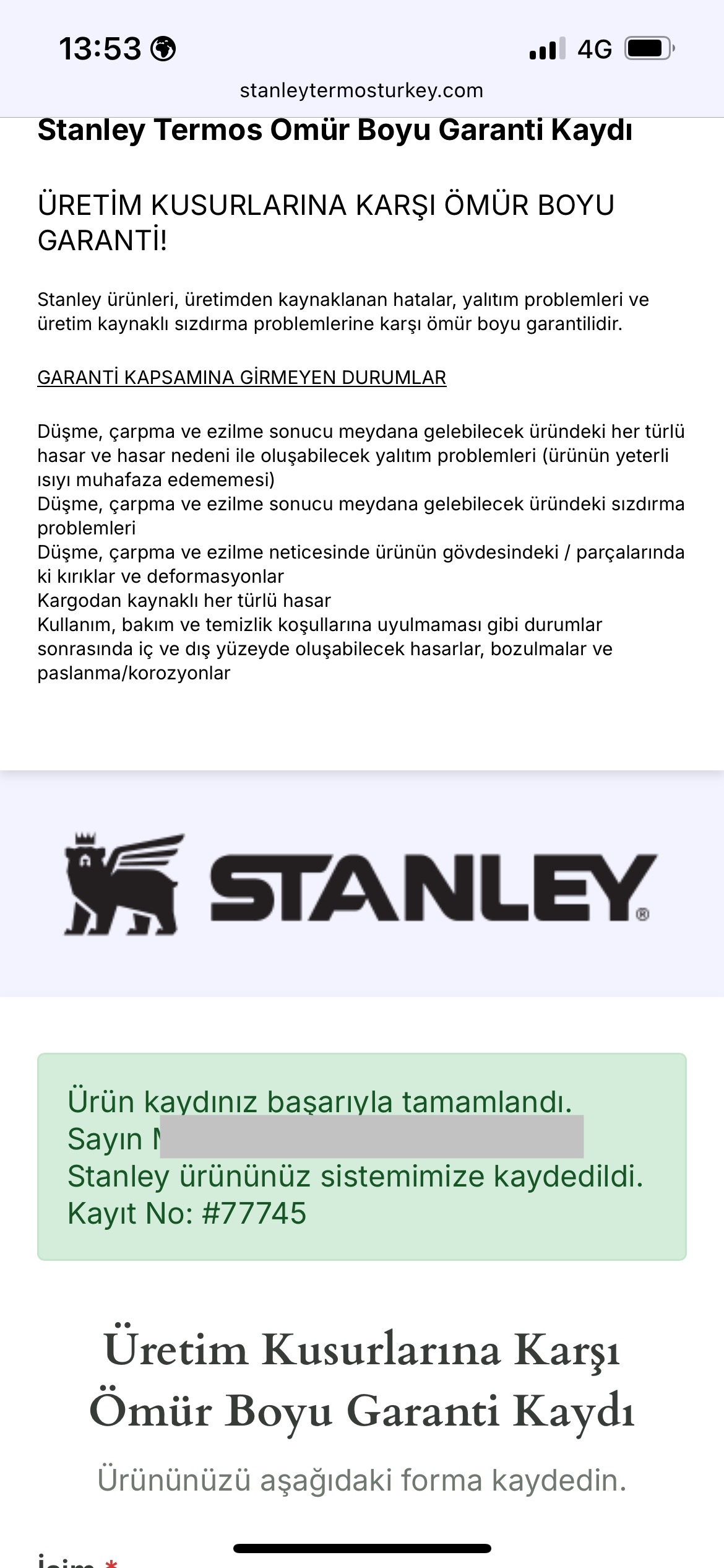 “https://stanleytermosturkey.com” a yönlendirdi. Termosun altındaki 693 ile başlayan barkod kodunu girip kayıt formunu doldurarak garanti kayıt işlemini tamamladım. 12 saat geçti onay maili gelmeyince içime kurt düştü.