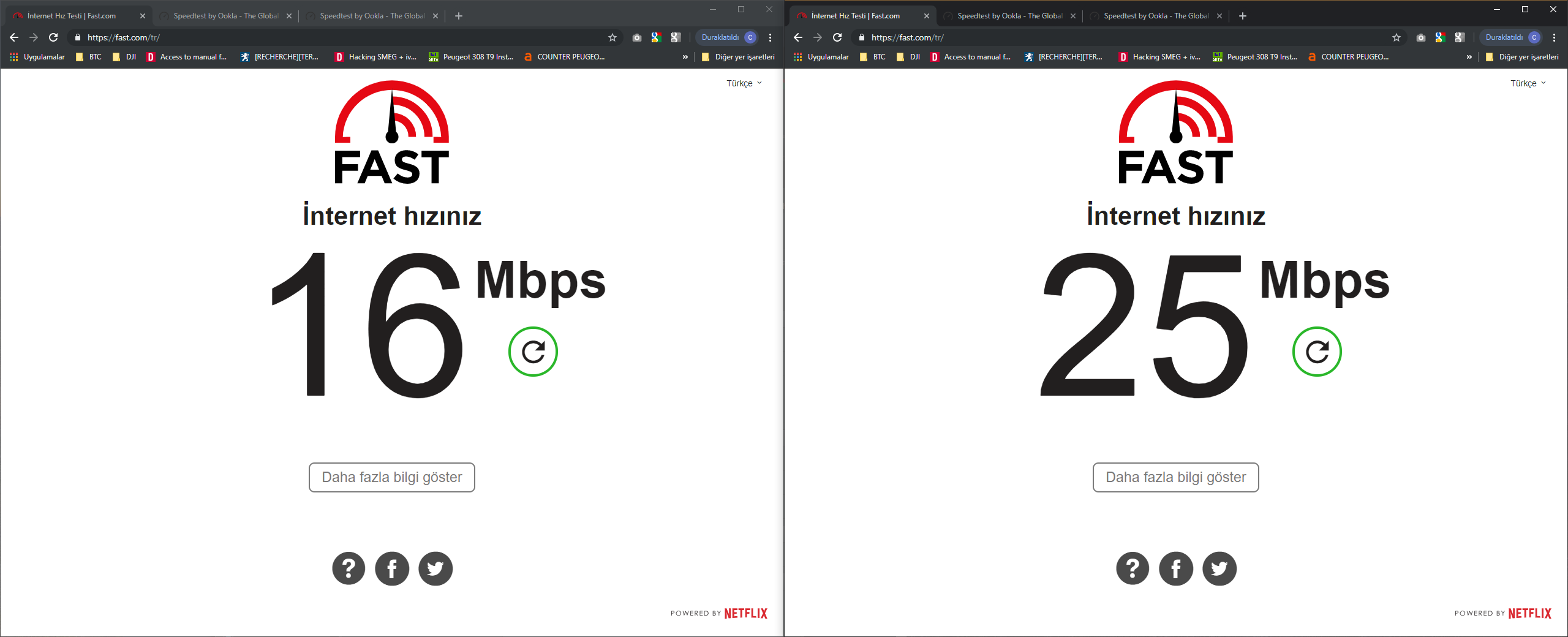 Speedtest 93-94 mbit download, 4,8-5,2 civarlarında upload gösteriyor ping ise superonline sunucularına 5 ms gösteriyor. Soldayken yine sol sunucularına ping 3 ms alıyordum benim için 2 ms kayıp fazla değil. Netflix bağlantısını fast.com üzerinden kontrol ettim akşam saat 7-8 civarlarında 35-40 mbps olarak ölçülürken şu anda 11:30 itibariyle 20 mbps olarak ölçüyor. (Avrupa'da şu an prime time olduğundan kaynaklı olabilir malum birçok Avrupa ülkesi bizden 2 saat geride veya başka bir neden olabilir bu düşüşün nedenini ayrıca araştırıcam, bilgisi olan varsa bilgi verirse sevinirim. Ping ise fast.com'da 55 olarak görünüyor.)
