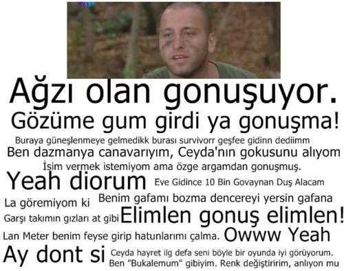 | Herkesten önce Anıl gitsin bi ondan sonra kim gidiyorsa gitsin gram umrumda değil. Ama o Anıl orda hak yerken, diğerlerinin gitmesine üzülmemek elde değil. En kötü performansı sergileyen adam bile Anıl'dan daha iyi. En azından emek harcıyor, survivor a yakışanı yapıyor. Bu adam çekilmiyor yada Acun kovmuyor da oturmuş 2 aydır totolak, takıma oyunu geçtim ada hayatında bile katkısı yok. Geçiyo kameraya bu böyle yapıyo gitmeli, şu söyle gitsin. Lan önce sen bi git tard |