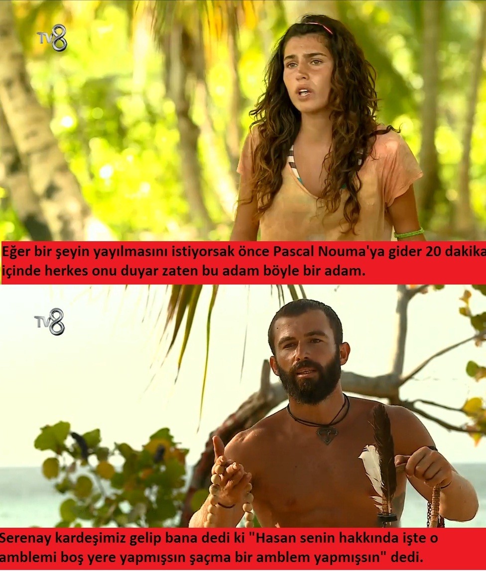 Pascal'in ardindan: Hakan dogukan'la konusurken serenayin aval aval bakip konuya dahil olma cabalari Hakan: Zaten Stres oldugun icin konusmanda sey yaptin boyle. Hakan: Nasil diyim sana? Hani cok dogru bisey soyledin ama normalde... Serenay: Anlatamadin Hakan: hayir , hayir o kadar net soyleyemicegin bir seyi... Hakan: o kadar guzel soyledin ki. Serenay: Evet cok nefis soyledin bu kizin her lafi her haraketi batiyor bana bu kadar sahte biri olabilirmi? |