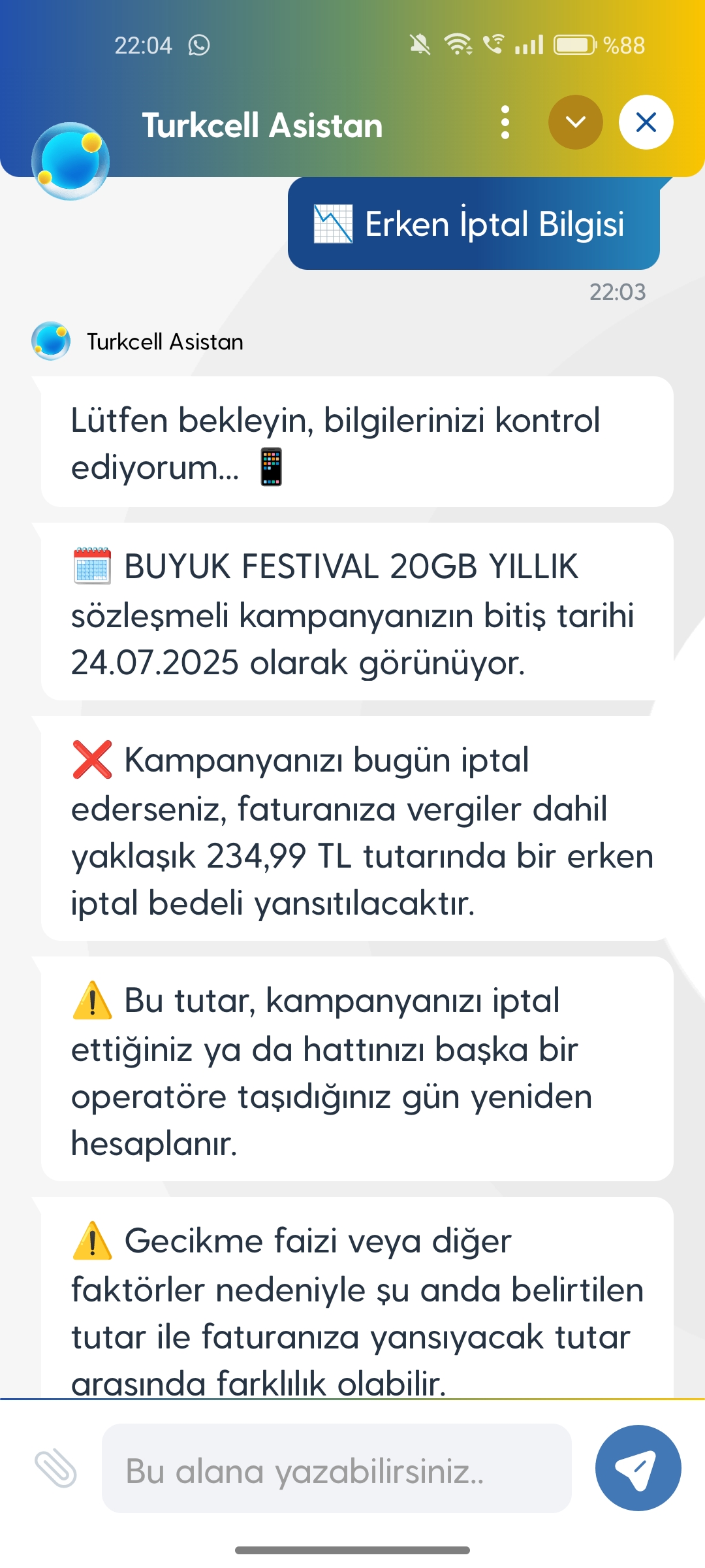 hattı Turkcell olanlar için yazıyorum. cayma bedelini uygulama içinden Turkcell asistana bağlanıp öğrenebilirsiniz. Erken iptal bilgisi yazmanız yeterli. Bende şimdi cayma bedeli çıkıyor ama 10 gün sonra son aya girdiğimde tekrar bakacağım. < Resime gitmek için tıklayın > |