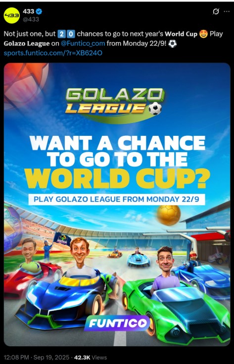 Geçen hafta, dünyanın en büyük futbol taraftar topluluğu olan 433’ten (sosyal ağlarında 100 milyonun üzerinde takipçisiyle) destek aldılar. Bu da ürünlerinin ve markalarının kalitesini ve güvenilirliğini gösteriyor. Bununla birlikte sports.funtico.com ve yeni oyunları Golazo League’in lansmanını yaptılar!