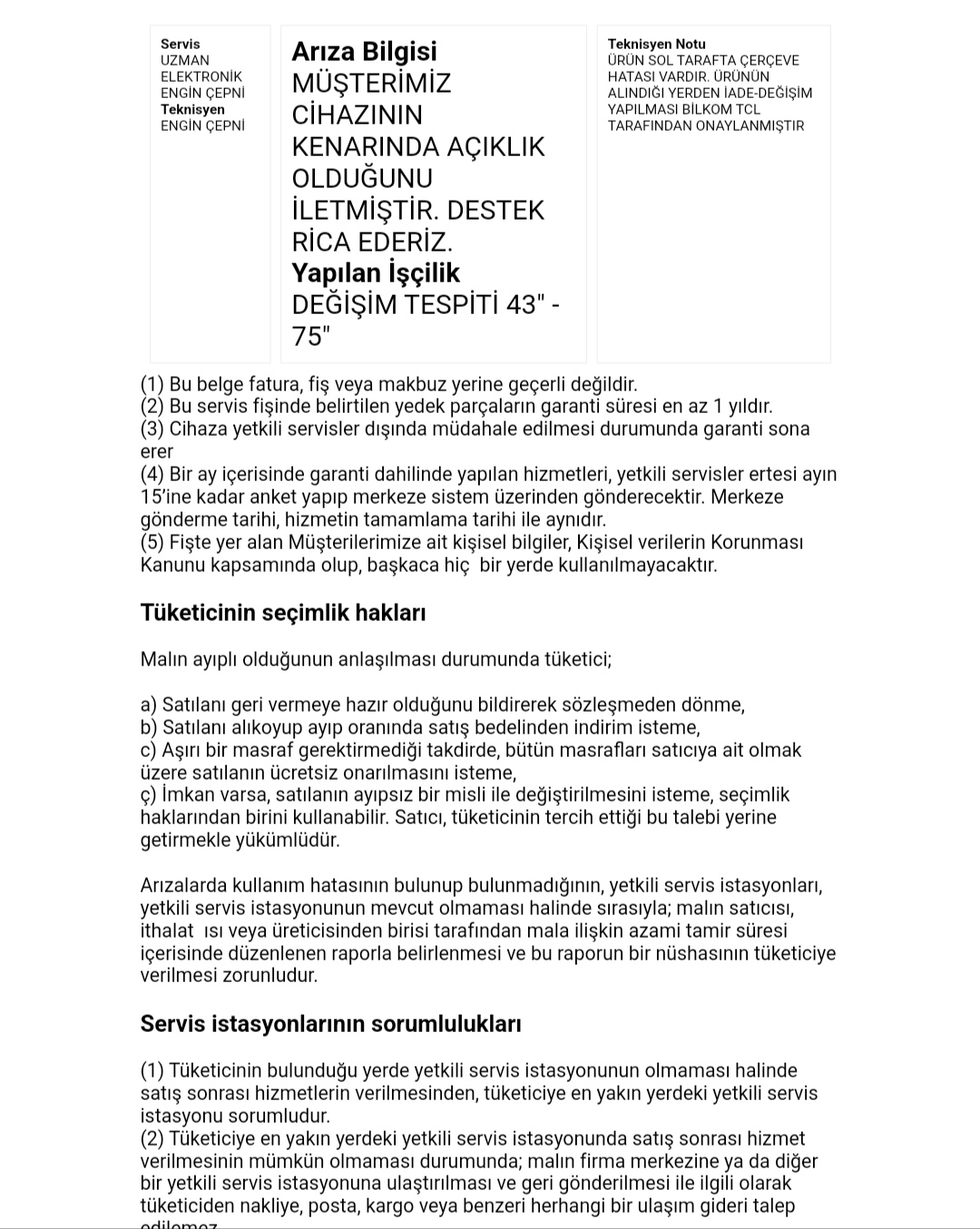 Bu konu artık delinin kuyuya taş atmasını da geçti. Aşağıda TCL'nin 3 ayrı kullanıcıya kırık panel için döndüğü TV değişim teklifleri var. Size neden yapmıyorlar aynı teklifi, arayıp sorun Bilkoma... Panel temin edemiyoruz deseler kanunen tazminat hakkınız doğar. Bu nedenle böyle yanıt vermezler. Daha önce de yazdığım gibi probleminizin tek çözüm yolu size farkını alarak şu an satışta olan benzer tv vermeleri. 65 C 845 veya 65 C 855. Ama bu TV'lerden birinin liste fiyatı 85,000, diğerinin 93.000 tl... % 70 bile talep etseler 59.500 tl tutar. Şahsen ben 59.500 TL nakit verip garantisiz tv alacağıma 50.000 tl'ye 2 yıl garantili 65 C 755 almayı tercih ederdim. Bilkomu arayıp görüşün, sorununuzun çözümü orası. Cevap vermiyorlarsa THH'ye başvurun. Ve prosedür bütün markalarda bu şekilde. 10 yıl yedek parça garantisi var, ama pratikte uygulanması imkansız. Çünkü panel teknolojisi sürekli değişim içinde. Yeni paneller eski tv'lere uymuyor. https://www.sikayetvar.com/tcl-televizyon/tcl-tv-panel-sorunu-ve-musteri-hizmetleri-deneyimi https://www.sikayetvar.com/tcl-televizyon/tcl-televizyon-teknik-destek-ilgisizligi https://www.sikayetvar.com/tcl-televizyon/tcl-tv-ekran-fiyati https://www.sikayetvar.com/tcl-televizyon/tcl-tv-panel-sorunu-ve-musteri-hizmetleri-deneyimi |