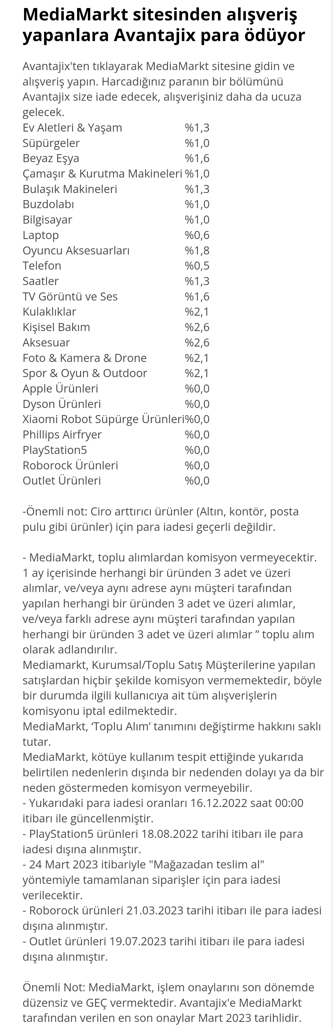 Avantajix üzerinden TV alan oldumu? Mediamarkt alışverişlerinde %1.6 para iadesi yapıyormuş ekran görüntüsünü paylaşıyorum birde altta mağazadan gel al da para iadesi yazıyor orayı tam anlayamadım bilen biri beni aydınlatabilirmi? < Resime gitmek için tıklayın > |