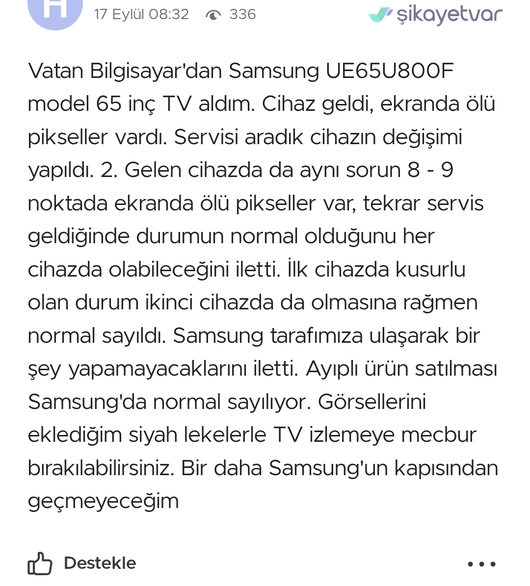 Sagolun hocam teşekürler tekrardan evet dogru diyorsunuz bende araştırmıştım , aynı yerde birden fazla vs olunca bile görüntüyü etkilemiyor diye çogu marka kabul etmiyormuş , dün tüketici hakem heyetine gitmiştim o söyledi bize ama etmezlese thh ye gidip haklarını arasınlar , garanti kapsımdayda halen ürün thh yardımcı oluyormuş ilgileniyorlar yani ama çok şükür bunlara gerek kalmadı bizim olayda