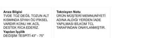 Sony TV'lerin bir serisinde üstten ızgara yapmışlardı ve sürekli buradan toz girip tv ekranında birikiyordu. Problem anlaşılınca tasarımı değiştirdiler ve mevcut tvlerde tozlanma sorunu yaşayanlara ücretsiz temizleme hizmeti verdiler. Montaj esnasında tozu gösterseydiniz servis rapor yazar ve TV'niz değiştirilirdi. Şimdi THH'ye gideceksiniz, THH bir bilirkişi atayacak, bilirkişi o tozlanmanın üretim aşamasında mı siz montajını yaptırdıktan sonra mı olduğunu belirleyecek ve buna göre bir karar verilecek. Diğer markalarda da aynı süreç yaşanırdı. TCL size temizleme teklif etmedi mi ?