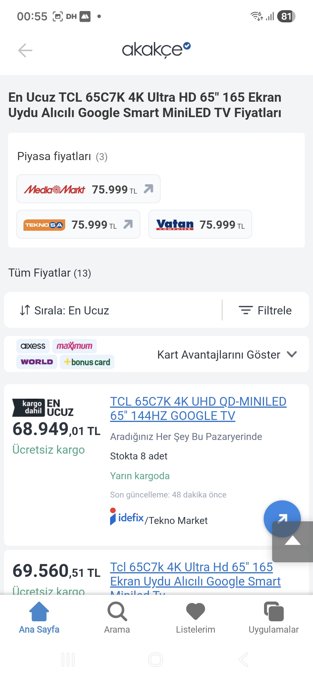 Söylediği tv nin Almanya fiyatı 760€. 65c7k nın Almanya fiyatı ise 799€. Aralarındaki fiyat farkı Avrupa’da 40€ iken burada 11.000TL. Yani 220€. KDV, ötv ile izah edin hadi bu farkı. < Resime gitmek için tıklayın > |