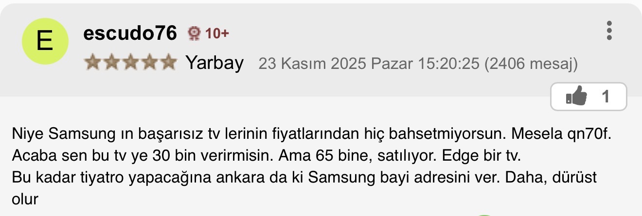 Niye Samsung ın başarısız tv lerinin fiyatlarından hiç bahsetmiyorsun. Mesela qn70f. Acaba sen bu tv ye 30 bin verirmisin. Ama 65 bine, satılıyor. Edge bir tv. Bu kadar tiyatro yapacağına ankara da ki Samsung bayi adresini ver. Daha, dürüst olur |