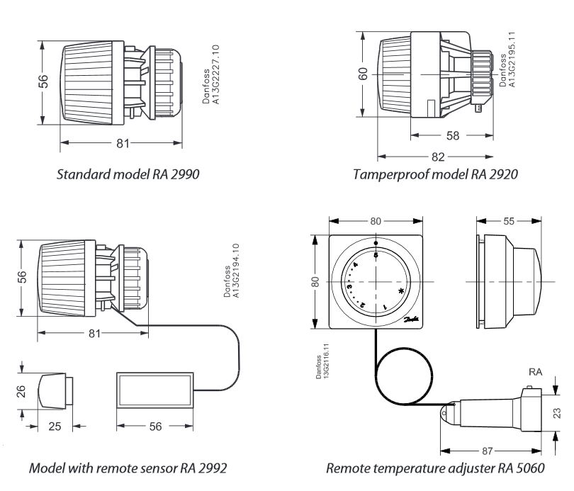 danfoss ras-c (sıvı sensörlü) ve danfoss ra 2000 termostatik vana kafalarının en ve boyu hemen hemen aynıdır.sadece ras-c kafası bombeli kısımdan sonra öne doğru darlaşıyor |