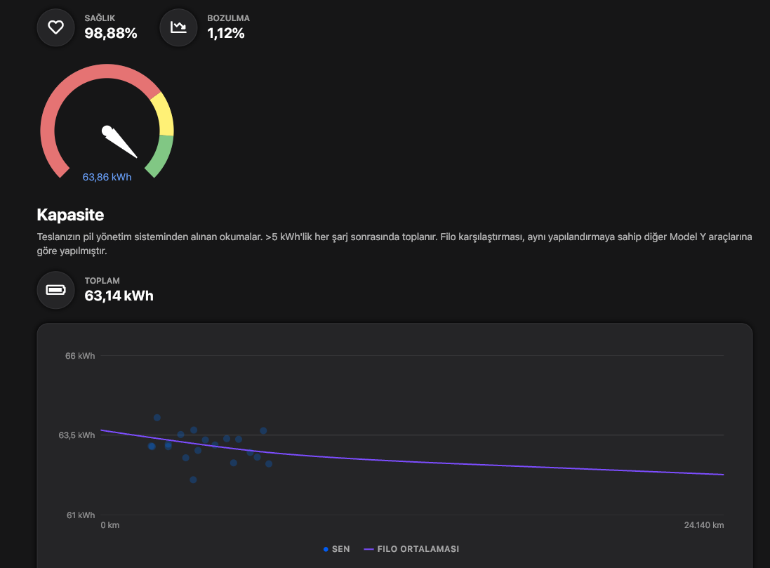 batarya ömrü takibi için ben aldığım günden beri Tessie uygulamasıyla takip ediyorum herkese tavsiye ederim aracın tam bir karakutusu yaptığınız her şarjı her km yi analiz edebiliyorsunuz tüm verileri tesla ile paylaşıyor yukarıdaki grafik 500000 araçlık filoda batarya bozulumu mor çizgi ile göstermiş ortalaması benim her şarjda aldığım değerler de noktalar şu anda 6200 km deyim ve bununla paralel bir kullanım gösteriyor link ....