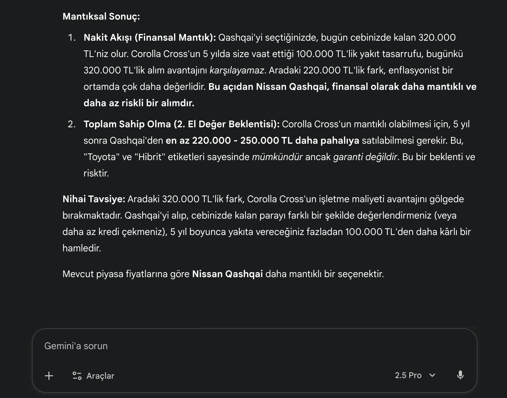 dün yapay zekaya kapsamlı bir karşılaştırma yapmasını söyledim. qashqai ve corolla cross un baz paketlerini karşılaştırdı. yıllık ortalama 15-20 bin km olmak üzere 5 yıl kullanım senaryosunda, fiyat, bakım, vergi, yakıt gibi tüm masrafları dahil ettiğinde en mantıklı seçenek hangisi dedim, qashqai dedi (: hem özellik bakımından bi tık yukarıda hem de ilk ödemede 300 bin liranın üzerinde bir tasarruf ettiriyor. 5 yılda yapılacak 100 bin km de bile fark en fazla 100k kadar kapanıyor. hatta başlangıçta kalan 300k yı değerlendirip o aradaki farkı kapatabileceğimi de söyledi (: ben de biraz qashqai tarafına kaydım açıkçası bu şekilde bi karşılaştırma yapınca. < Resime gitmek için tıklayın > |