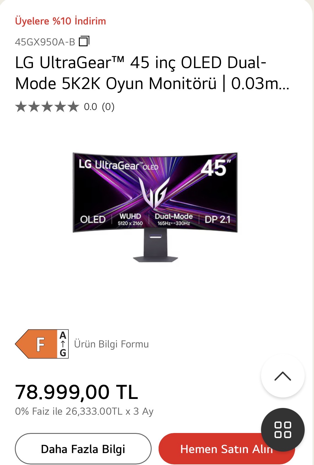 İnternet sitesindeki link hatalı. Şu şekilde girin lütfen. Ben de fiyatı gördükten sonra başka bir monitörün linkini düzenleyerek buldum. www.lg.com/tr/monitor/oyun-monitorleri/45gx950a-b/ |