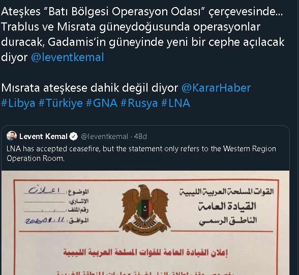 Cease-fire only covers Tripoli. Not Misrata şaka gibi adamlar. Ateşkes sadece Trablus için geçerli,misrata şehri için değil diyorlar. Tabi teyite muhtaç,ama dansöz gibiler.Ateşkes uzun sürmeyebilir! < Resime gitmek için tıklayın > https://twitter.com/Fatih_S_Mehmed/status/1216133606210461698 |