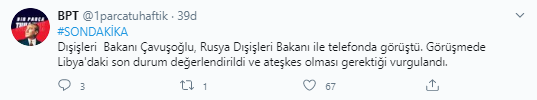 Dışişleri Bakanlığı Sözcüsü Aksoy, "Libya’daki Türk çıkarlarının hedef alınması halinde darbeci Hafter unsurlarını meşru hedef telakki edeceğiz." ifadesini kullandı.