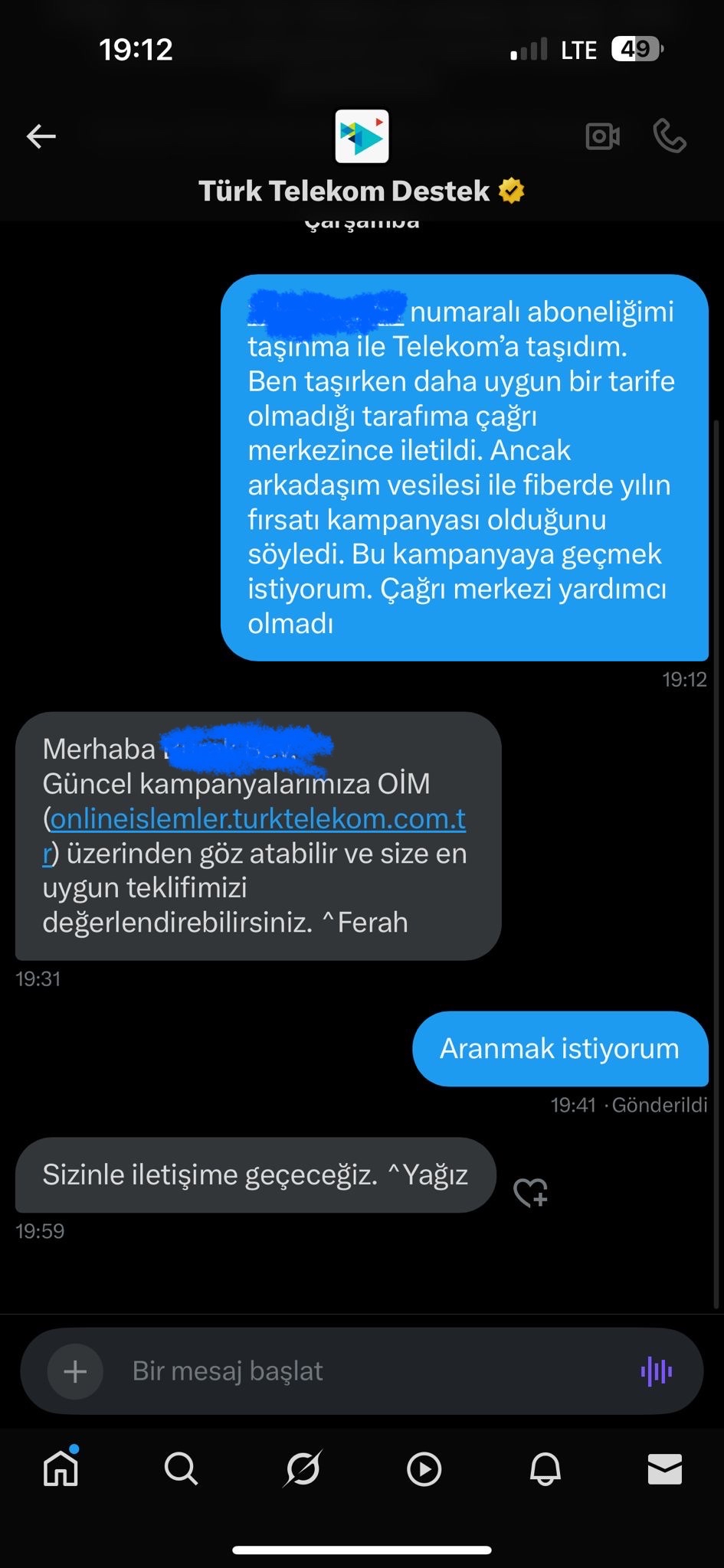 | Twitterden DM atın TTdesteğe başta itiraz ediyorlar zaten benim şikayetimi ilgile birime iletin diye özellikle diretin. İlgili birim size ulaşacak mesajını alana kadar presleyin düzgünce. Ben arkadaşlarımın 3'ünü TT'ye taşıdım. Hat işlemleri tamamlanıp taşındıktan 1 gün sonra da anlattığım şekilde Fiberde Yılın Fırsatına geçirdim geçilmiyor diyende sıkıntı vardır ondan inanmayın prese devam. |