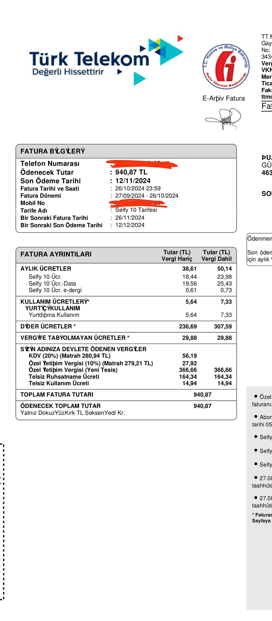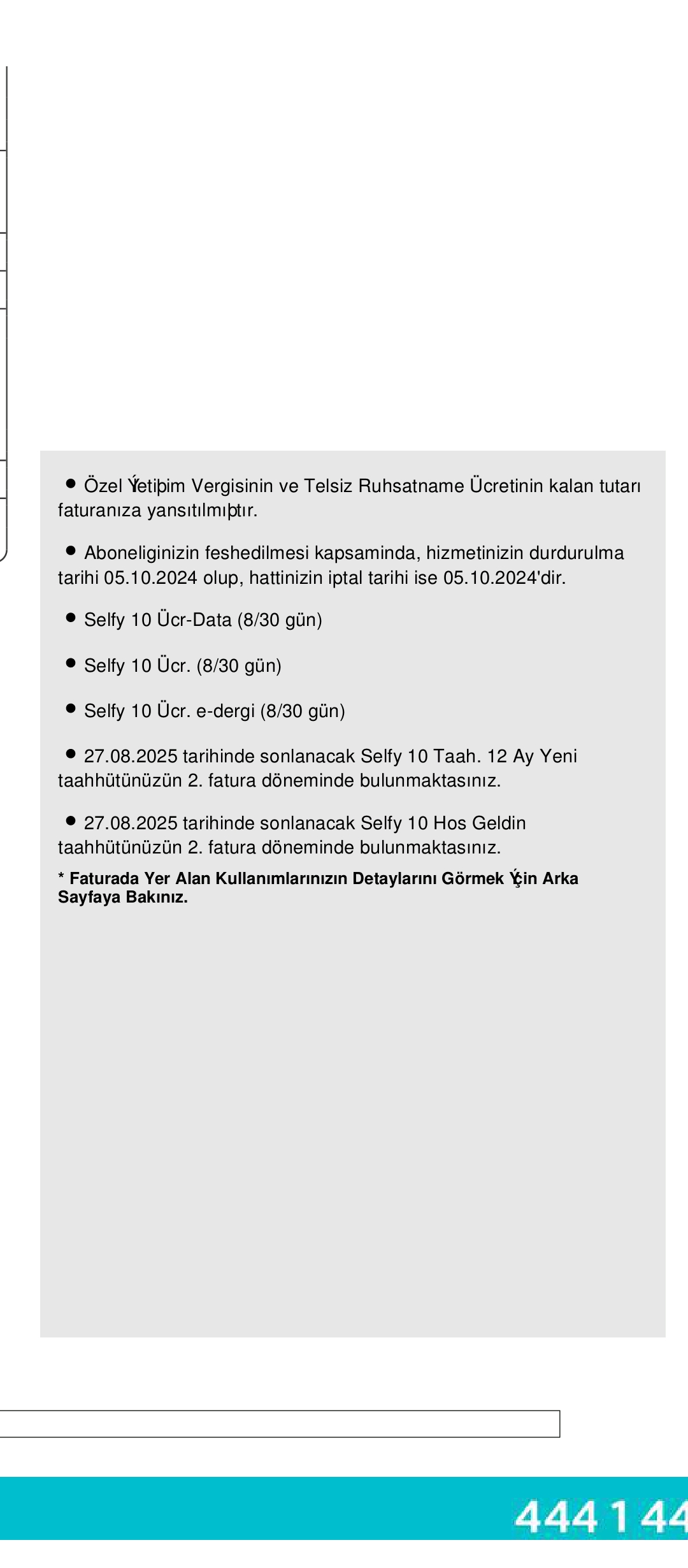 17.09.2024 Tarihinde Türk Telekom Mağazasından Kendime 505 24* **** nolu hattı satın aldım. Fakat çekim kalitesi 2 mbps altında olduğu için memnun kalmadım hattı taşımak istedim fakat yeni hatlarda 3 ay boyunca numara taşımanın mümkün olmadığı sebebiyle hattı taşıyamadım. Bunun üzerine müşteri hizmetlerini aradığımda bana sadece 90 TL cayma bedeli ile faturasıza geçiş yapabileceğim söylenmesi üzerine işlemi onayladım ve faturasız hatta geçişimi sağladım. Üstelik 1 ay bile olmamıştı hattı alalı. Gerek Konuşmada gerekse internette acayip sorun yaşadım defalarca arayıp şikayet oluşturmama rağmen hiç bir düzelme olmadı. Arama kayıtlarım sistemde mevcuttur. Son fatura olarak bana 940 TL fatura gönderilmiştir nedenini öğrenmek için müşteri hizmetlerini aradığımda bana 300 TL cayma bedeli yansıtıldığı mı öğrendim. Zaten çekim kaliteniz düşükken bide bu kadar fatura göndermeleri ne kadar doğru bilmiyorum. Yatırdığım fatura ücretimin iadesini talep ediyorum aksi halde tüketici mahkemesine ve adliyeye şikayette bulunacağım. İnternet hızlarını ekran görüntüsü olarak paylaşmaktayım. Bu faturamı iade alabilmem mümkün mü < Resime gitmek için tıklayın >< Resime gitmek için tıklayın >< Resime gitmek için tıklayın >< Resime gitmek için tıklayın >