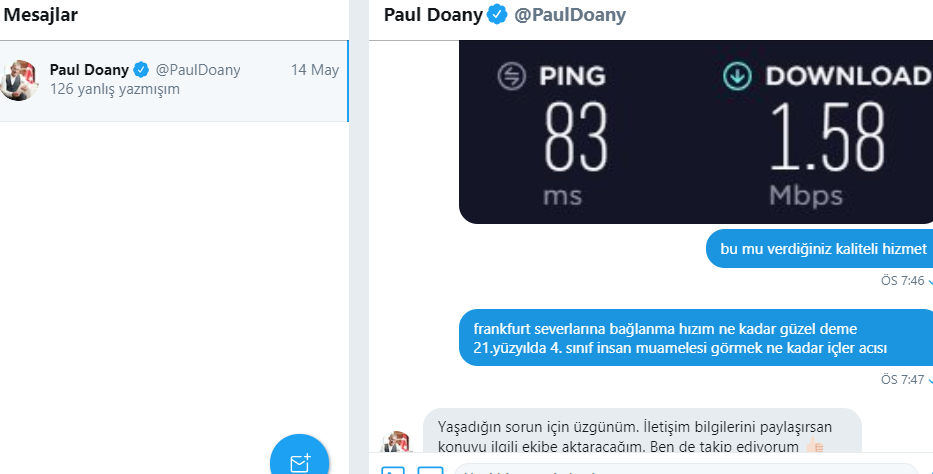 | Sorun düzeltildi dün telefonla müşteri hizmetleri tarafından arandım şikayetin hız sorunu olarak açılmış bana sorun görülmemiştir denildi. Bende müşteri hizmetlerine patladım sorunu anlattım taahhüdümü iptal edicem en sonunda filan baya bir uzun konuştum telefonu kapattıkdan sonra 2 dk sonra tekrardan aradılar bu sefer bölge müdürlüğünden aradılar bende sorunun yurt dışı bant genişliğinden olduğunu söyledim bana vpn dns kullanıp kulanmadığımı soruyor bende o kadar salak değilim onları biliyorum dedim tamam sorunu incelicez dedi akşam 1 saatlik elektrik kesintisi oldu elektrik geldiğinde sorunun düzeldiği frankfurt ve amsterdam serverlarından speettest yaptığımda akk bitmiş halliyle 19 mb/s hız verdi twitchde de skıntısız 1080p den yayın izleye biliyorum 10 dk önce müşteri hizmetleri aradı yurt dışı bant genişliğinde sorun olduğunu düzelttiklerini belirttiler. Şuanlık sorun düzeldi sorunu yaşayanlar hiç uğraşmadan twitter da ceo ya mesaj atmanızı şiddetle tavsiye ediyorum. |