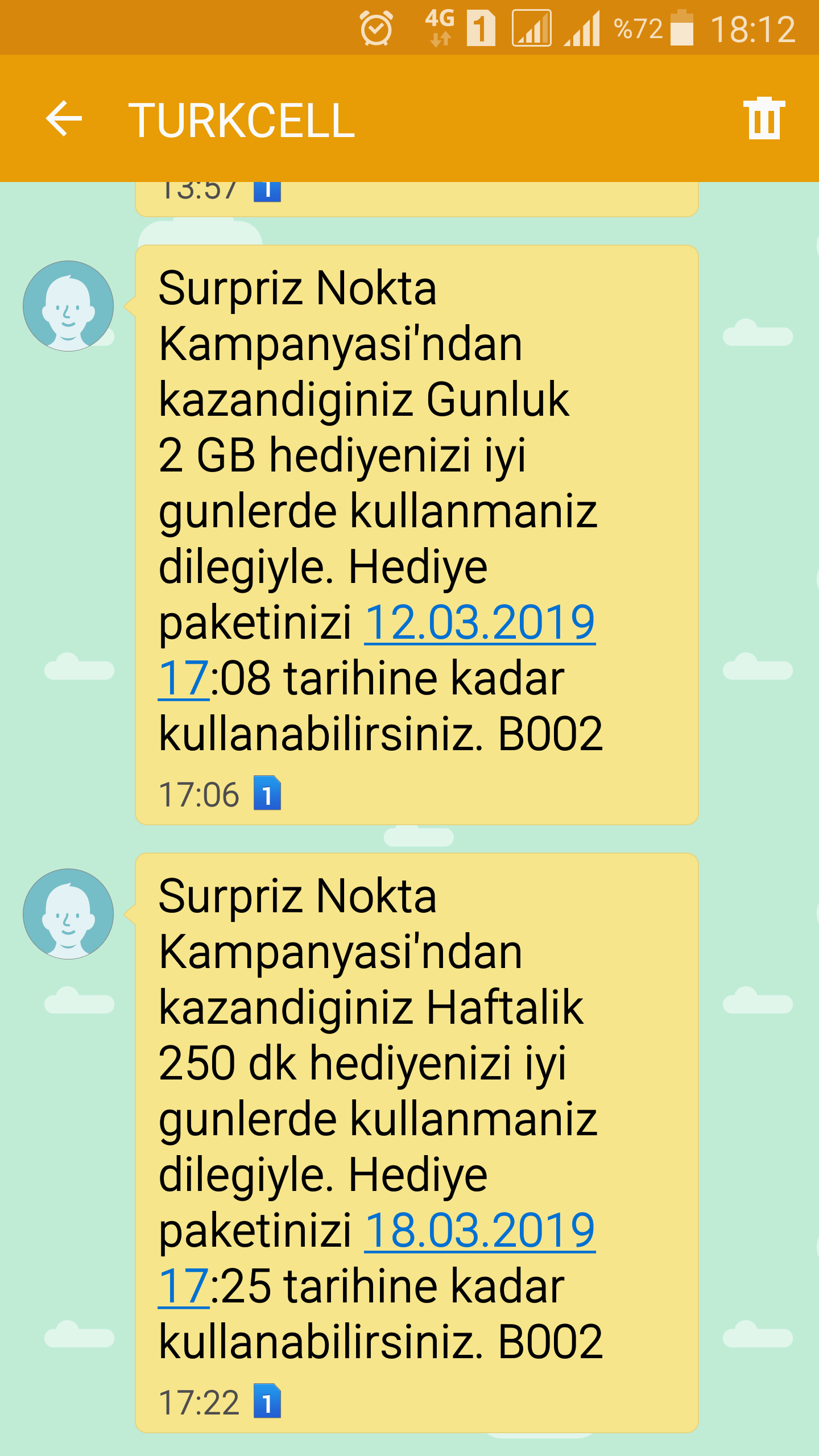 lacivertleri ben denemiştim onlar da aynı hediyeleri veriyor, neden şekilleri öyle anlamadım haftalıkların olduğu zaman daha eğlenceliydi, hatta geçen sene 5gb aylık 10gb aylık gibi daha büyük hediyeler de varmış ben o zamanlara yetişemedim |