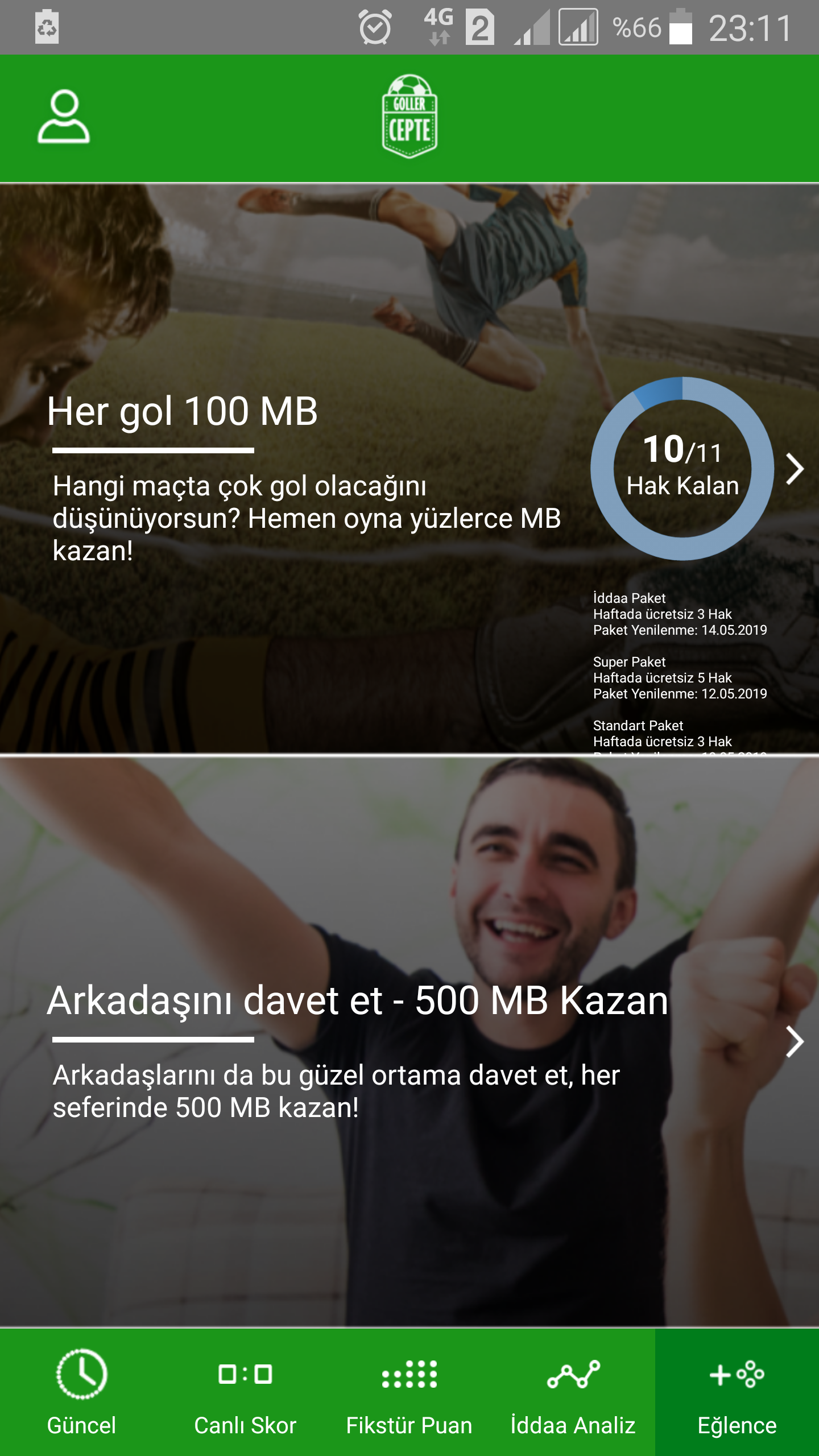 Aylık Goller Cepte Standart Paket alırsanız haftada 6 maç,ayda 24 maç tahmin hakkınız olur.En kötü ihtimalle ayda 3GB internet alırsınız.